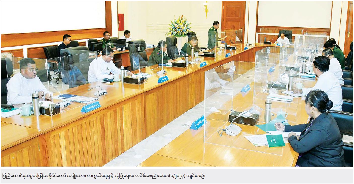 ထို့နောက် ပြည်ထဲရေးဝန်ကြီးဌာန ပြည်ထောင်စုဝန်ကြီးက ဆွေးနွေးတင်ပြရာတွင် လုံခြုံရေး၊ တည်ငြိမ်အေးချမ်းရေးနှင့် တရားဥပဒေစိုးမိုးရေးနှင့် ပတ်သက်၍ မဲမသမာမှုကြောင့် တပ်မတော်မှ နိုင်ငံတော်တာဝန်များကို ထမ်းဆောင်ခဲ့ရကြောင်း၊ နိုင်ငံတော်စီမံအုပ်ချုပ်ရေးကောင်စီမှ တာဝန်ယူပြီးနောက်ပိုင်း ငြိမ်းချမ်းစွာ ဆန္ဒပြမှုများမှတစ်ဆင့် ဆူပူမှု၊ အကြမ်းဖက်မှုနှင့် ဖျက်ဆီးသတ်ဖြတ်မှုများ ဖြစ်ပေါ်ခဲ့ကြောင်း၊ လက်ရှိအချိန်တွင် ဆူပူဆန္ဒပြမှုများ မရှိတော့သော်လည်း အကြမ်းဖက်မှုများရှိနေ ဆဲဖြစ်ကြောင်း၊ လက်ရှိအခြေအနေတွင် ရွေးကောက်ပွဲ ပြုလုပ်နိုင်ခြင်းမရှိစေရန် အကြမ်းဖက်သမားများက အကြမ်းဖက်နှောင့်ယှက်ခြင်း၊ သတ်ဖြတ်ခြင်း၊ ဖျက်ဆီးခြင်းများကို လုပ်ဆောင်လျက်ရှိကြောင်း၊ အုပ်ချုပ်မှုယန္တရားများ လည်ပတ်နိုင်ရန်အတွက် ရပ်ကွက်၊ ကျေးရွာအုပ်ချုပ်ရေးမှူးများ အချို့နေရာများတွင် ခန့်အပ်ရန် ကျန်ရှိနေသေးကြောင်း၊ မိမိ တင်ပြခဲ့သည့် အထက်ပါအခြေအနေများအရ NUG CRPH နှင့် PDF အမည်ခံ အကြမ်းဖက်သမားများ အနေဖြင့် လာမည့်ရွေးကောက်ပွဲကျင်းပနိုင်ခြင်း မရှိစေရန်အတွက် ရွေးကောက်ပွဲအကြိုကာလ ရွေးကောက်ပွဲကော်မရှင်ရုံးများ၊ လဝကရုံးများနှင့် နိုင်ငံရေးပါတီရုံးများကို မီးရှို့ မိုင်းထောင် ဖောက်ခွဲခြင်း၊ နိုင်ငံရေးပါတီဝင်များနှင် လွှတ်တော်ကိုယ်စားလှယ် လောင်းများကို ခြိမ်းခြောက်သတ်ဖြတ်ခြင်းများ၊ အုပ်ချုပ်မှုယန္တရားများ မလည်ပတ်နိုင်စေရန်အတွက် ရာအိမ်မှူး၊ ဆယ်အိမ်မှူးနှင့် ရပ်ကွက်အုပ်ချုပ်ရေးမှူးများ လုပ်ကြံသတ်ဖြတ်ခြင်းများရှိသကဲ့သို့ ပြည်သူ များအကြား အကြောက်တရားဖြင့် လွှမ်းမိုးနိုင်ရန် အတွက် ၎င်းတို့နှင့် အယူအဆမတူသည့်သူများကို ဒလန်ဟု စွပ်စွဲပြီး လုပ်ကြံသတ်ဖြတ်မှုများကို လုပ်ဆောင်လာနိုင်ပါကြောင်း၊ လုံခြုံရေး၊ တည်ငြိမ် အေးချမ်းရေးနှင့် တရားဥပဒေစိုးမိုးရေး ရှုထောင့်အရ ကြည့်ရမည်ဆိုပါက အကြမ်းဖက်အုပ်စုများ တဖြည်းဖြည်း ချုပ်ငြိမ်းသွားသည့် အခြေအနေအထိ လုပ်ဆောင်သွားရန် အချိန်အတိုင်းအတာ တစ်ခုအထိ လိုအပ်ပါကြောင်း ဆွေးနွေးတင်ပြသည်။