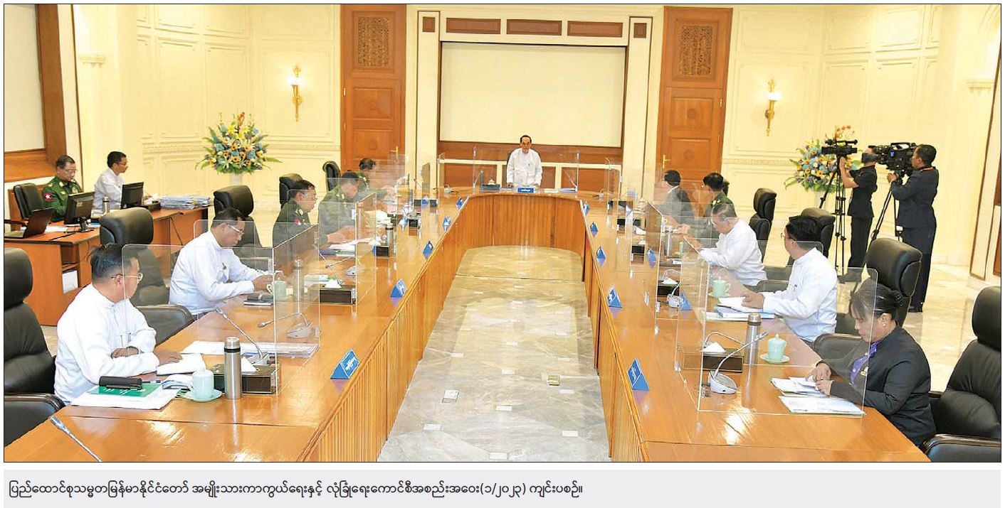 အဆိုပါကာလကဖြစ်ပေါ်ခဲ့သည့် အခြေအနေများအရ ဖွဲ့စည်းပုံအခြေခံဥပဒေနှင့်အညီ ပြဋ္ဌာန်းထား သည့် သက်တမ်းများအလိုက် တပ်မတော်ကာကွယ်ရေးဦးစီးချုပ်အား နိုင်ငံတော်တာဝန်ကို ထမ်းဆောင်ရန် အမျိုးသားကာကွယ်ရေးနှင့် လုံခြုံရေးကောင်စီအစည်းအဝေးသို့ တက်ရောက်လာသူများက သဘောတူ အတည်ပြုခဲ့ပါကြောင်း၊ မိမိတို့အစိုးရအနေဖြင့် ယခုကဲ့သို့ နိုင်ငံတော်တာဝန်ကို ထမ်းဆောင်ခဲ့ရာတွင် ရှေ့လုပ်ငန်းစဉ်()ရပ် ချမှတ်ဆောင်ရွက်ခဲ့ရာ၌ အကောင်အထည်ဖော် ဆောင်ရွက်ခဲ့မှု၊ တိုးတက်ပြောင်းလဲလုပ်ဆောင်မှု အခြေအနေများကို တင်ပြသွားမည်ဖြစ်ပါကြောင်း။