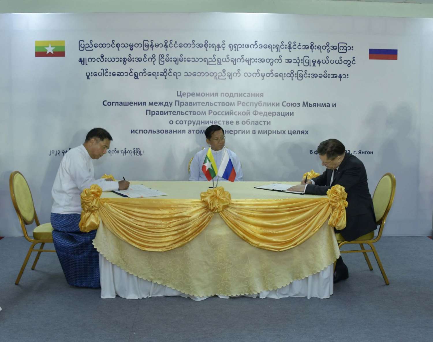 ထို့ပြင် ပြီးခဲ့သည့် ၂၀၂၂ ခုနှစ်၊ စက်တင်ဘာလ ဗလာဒီဗော့စတော့မြို့တွင် ကျင်းပခဲ့သည့် သတ္တမအကြိမ်မြောက် အရှေ့ဖျားစီးပွားရေးဖိုရမ် (7th Eastern Economic Forum-EEF) ကာလအတွင်း လျှပ်စစ်စွမ်းအားဝန်ကြီးဌာန၊ သိပ္ပံနှင့်နည်းပညာဝန်ကြီးဌာနနှင့် “ROSATOM” တို့အကြား ၂၀၂၃ ခုနှစ်နှင့် ၂၀၂၄ ခုနှစ်တွင် နျူကလီးယားစွမ်းအင်အားငြိမ်းချမ်းစွာအသုံးပြုမှု ပူးပေါင်းဆောင်ရွက်ရေးလမ်းပြ မြေပုံကိုလည်း လက်မှတ်ရေးထိုးခဲ့ကြပါကြောင်း၊ ယနေ့တွင်လည်း နျူကလီးယား နည်းပညာ အသုံးချနယ်ပယ်(၁၄)ခုတွင် အစိုးရအချင်းချင်း ပူးပေါင်းဆောင်ရွက်ရေးဆိုင်ရာ သဘောတူညီချက်တစ်ခုကိုလည်း လက်မှတ်ရေးထိုးတော့မည်ဖြစ်ပါကြောင်း။