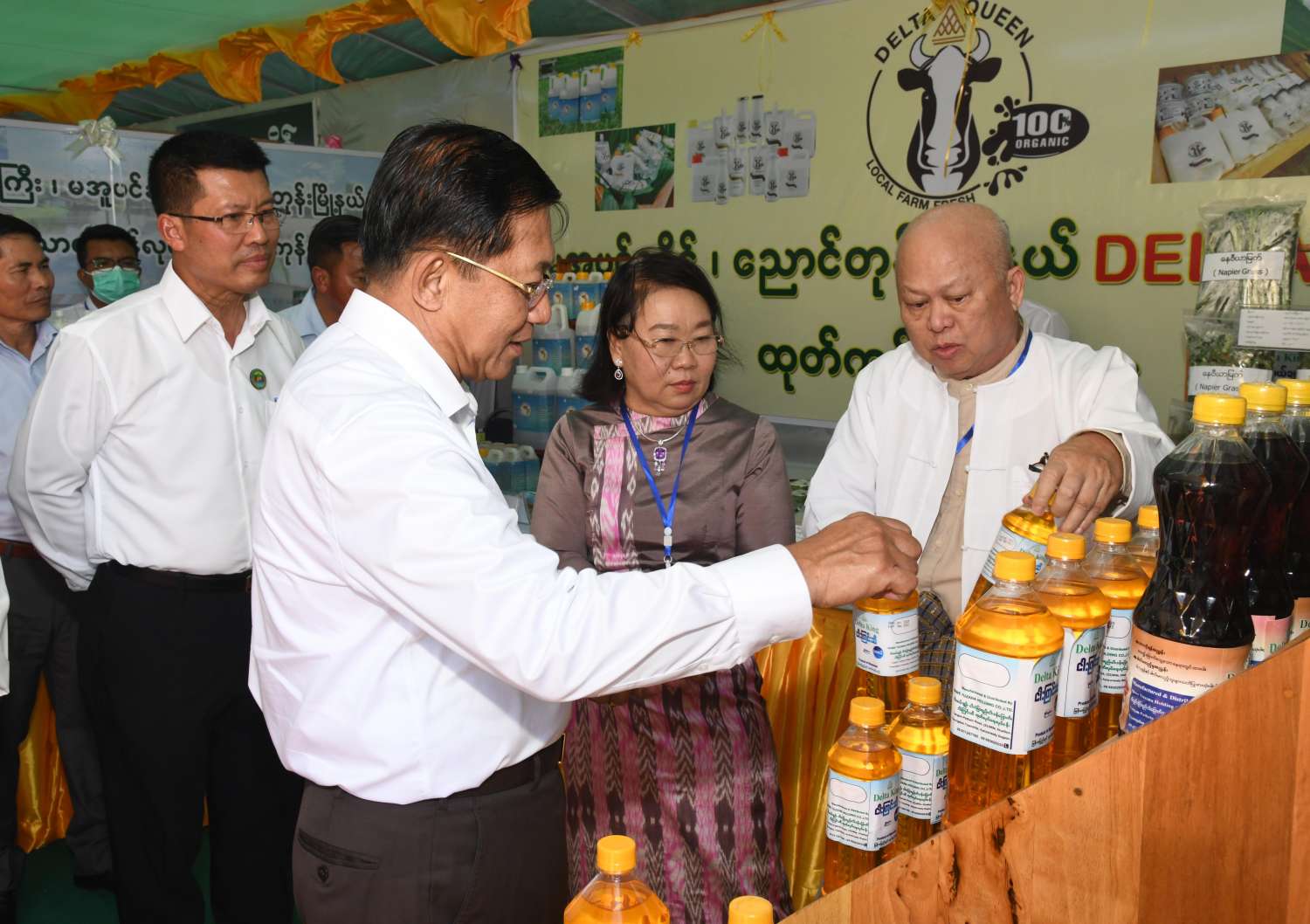 ယင်းနောက် နိုင်ငံတော်စီမံအုပ်ချုပ်ရေးကောင်စီဥက္ကဋ္ဌ နိုင်ငံတော်ဝန်ကြီးချုပ်သည် ခင်းကျင်းပြသထားသည့် ရေထွက်ကုန်ပစ္စည်းများ၊ စားသောက်ကုန်၊ လူသုံးကုန်၊ စက်မှုလက်မှုထုတ်ကုန်၊ ရိုးရာလက်မှု ထုတ်ကုန်များ၊ အဝတ်အထည်များ စသည့်ထုတ်ကုန်ပစ္စည်းများ ခင်းကျင်းပြသထားရှိမှုများကို ပြကွက်တစ်ခုချင်းစီအလိုက် စိတ်ဝင်တစားဖြင့် လေ့လာခဲ့ပြီး ဈေးကွက်ရရှိမှုအခြေအနေများကို မေးမြန်းဆွေးနွေးရာ လုပ်ငန်းအလိုက် စီးပွားရေးလုပ်ငန်းရှင်များက လိုက်လံရှင်းလင်းတင်ပြခဲ့ကြကြောင်း သတင်းရရှိသည်။