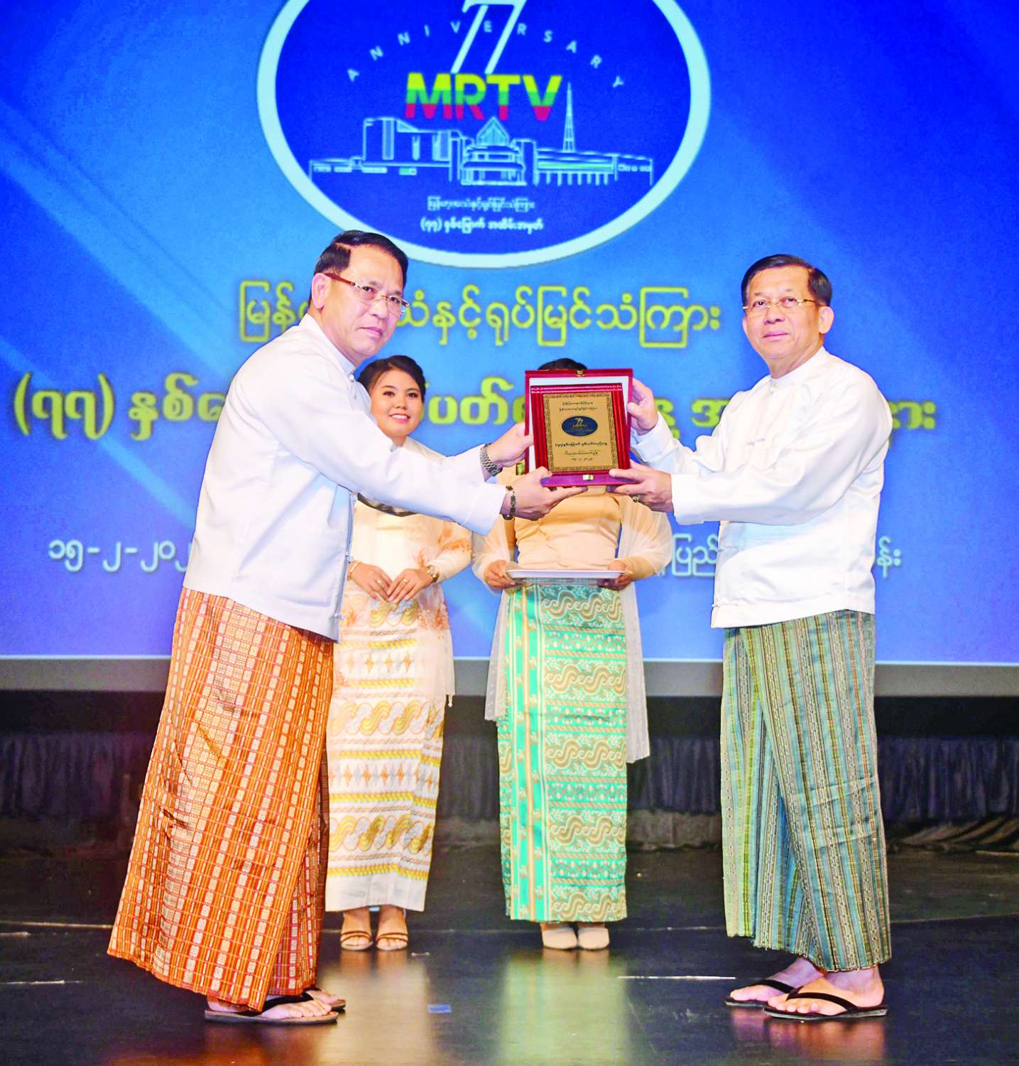 ထို့နောက် နိုင်ငံတော်စီမံအုပ်ချုပ်ရေးကောင်စီဥက္ကဋ္ဌ နိုင်ငံတော်ဝန်ကြီးချုပ်က 10th ASEAN Quiz (Regional Level) ပြိုင်ပွဲအား နိုင်ငံတော်အဆင့်နှင့်အညီ ခမ်းနားထည်ဝါစွာ စီစဉ်ကျင်းပနိုင်မှုနှင့် (၇၅)နှစ်မြောက် စိန်ရတုလွတ်လပ်ရေးနေ့အထိမ်းအမှတ် “တူယှဉ် နွှဲပျော်ဂီတပွဲတော်” Season-2 အား အောင်မြင်စွာ စီစဉ်တင်ဆက်နိုင်မှုတို့အတွက် မြန်မာ့အသံနှင့်ရုပ်မြင်သံကြားမှ ဝန်ထမ်းများအတွက် ဂုဏ်ပြုဆုနှင့် မြန်မာ့အသံနှင့် ရုပ်မြင်သံကြားအတွက် ဂုဏ်ပြုချီးမြှင့်ငွေ ၇၇ သိန်းကို ချီးမြှင့်ပေးအပ်ရာ ပြန်ကြားရေးဝန်ကြီး ဌာန ပြည်ထောင်စုဝန်ကြီးက လက်ခံရယူသည်။