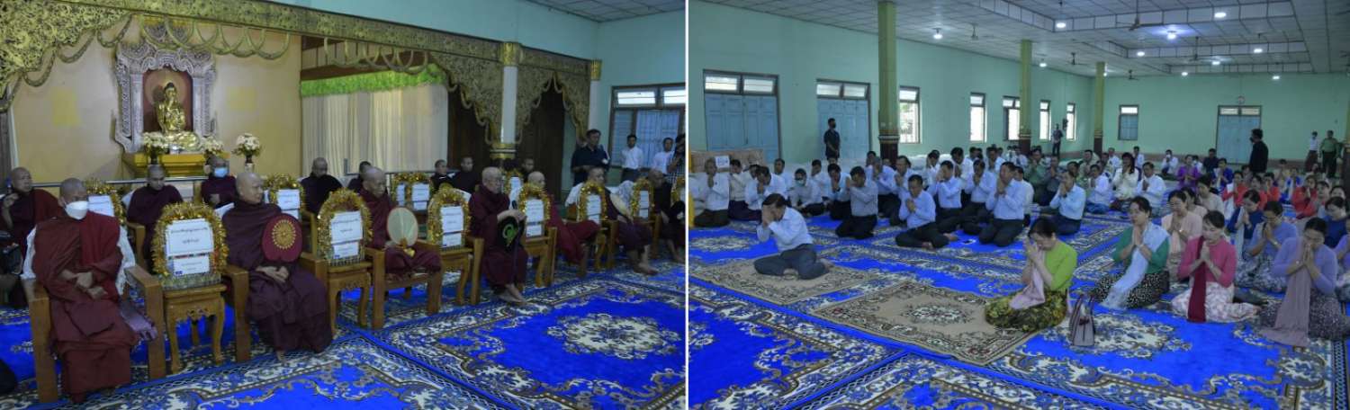 ဦးစွာ နိုင်ငံတော်စီမံအုပ်ချုပ်ရေးကောင်စီဥက္ကဋ္ဌ နိုင်ငံတော်ဝန်ကြီးချုပ်နှင့်ဇနီး၊ အဖွဲ့ဝင်များသည် ရန်ကင်းကျောင်းတိုက်ဆရာတော်ထံမှ ငါးပါးသီလခံယူဆောက်တည်ကြပြီး ဆရာတော်သံဃာတော်များ ရွတ်ပွားချီးမြှင့်တော်မူကြသည့် မေတ္တာသုတ်ပရိတ်တရားတော်များကို နာယူကြသည်။