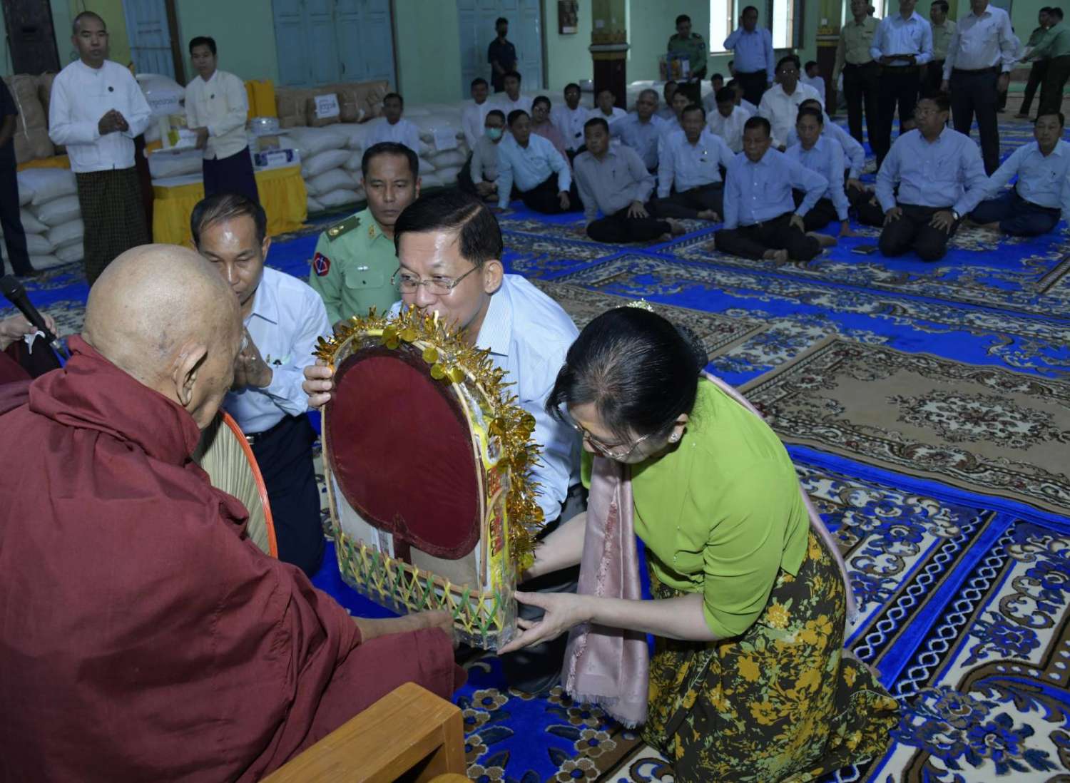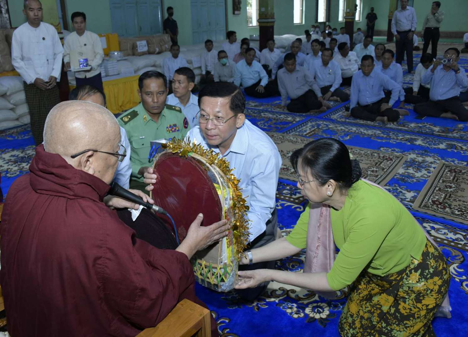 အခမ်းအနားသို့ နိုင်ငံတော်ဩဝါဒါစရိယ၊ မဟာဝိဇ္ဇာသိပ္ပံကျောင်းတိုက်ဆရာတော် အဘိဓဇမဟာရဋ္ဌဂုရုဘဒ္ဒန္တသူရိယနှင့် ရန်ကင်းကျောင်းတိုက်ဆရာတော် ဒွိပိဋကဒရဒွိပိဋကကောဝိဒ အဂ္ဂမဟာပဏ္ဍိတဘဒ္ဒန္တပညာဝံသတို့အမှူးပြုသည့် မုံရွာမြို့ပေါ်ရှိ စာသင်တိုက် ၇ တိုက်တို့မှ ဆရာတော်၊ သံဃာတော်များ ကြွရောက်ချီးမြှင့်တော်မူကြပြီး နိုင်ငံတော်စီမံအုပ်ချုပ်ရေးကောင်စီဥက္ကဋ္ဌ နိုင်ငံတော်ဝန်ကြီးချုပ်ဗိုလ်ချုပ်မှူးကြီး မင်းအောင်လှိုင်နှင့်ဇနီးဒေါ်ကြကြူလှ၊ ကောင်စီတွဲဖက်အတွင်းရေးမှူး ဒုတိယဗိုလ်ချုပ်ကြီး ရဲဝင်းဦးနှင့်ဇနီး၊ ကောင်စီဝင်များ၊ ပြည်ထောင်စုဝန်ကြီးများ၊ စစ်ကိုင်းတိုင်းဒေသကြီးဝန်ကြီးချုပ် ဦးမြတ်ကျော်နှင့်ဇနီး၊ ကာကွယ်ရေးဦးစီးချုပ်ရုံးမှ တပ်မတော်အရာရှိကြီးများနှင့်ဇနီးများ၊ အနောက်မြောက်တိုင်းစစ်ဌာနချုပ်တိုင်းမှူး ဗိုလ်ချုပ်သန်းထိုက်နှင့် တာဝန်ရှိသူများတက်ရောက်ကြသည်။