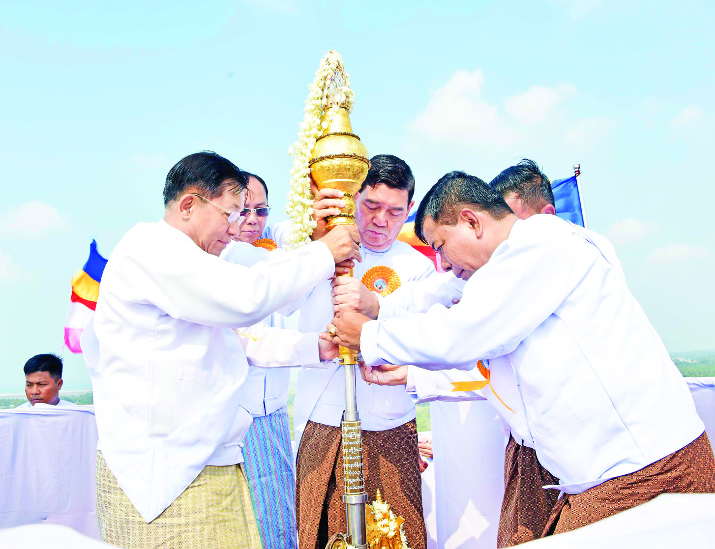 ယင်းနောက် နိုင်ငံတော်စီမံအုပ်ချုပ်ရေးကောင်စီဥက္ကဋ္ဌ နိုင်ငံတော်ဝန်ကြီးချုပ်နှင့်ဇနီး၊ အဖွဲ့ဝင်များသည် ရတနာစိန်ဖူးတော်၊ ငှက်မြတ်နားတော်တို့ကို မင်္ဂလာဝေါယာဉ်တော်ဖြင့် ပင့်ဆောင်၍ စေတီတော်မြတ်ကြီးအား လက်ယာရစ်လှည့်လည်ပူဇော်ကာ မဟာမင်္ဂလာမဏ္ဍပ်တော်ကြီးရှေ့ရှိ ခေတ္တအပူဇော်ခံနေရာသို့ ပို့ဆောင်ကြသည်။ ထို့နောက် မင်္ဂလာအချိန်တွင် နိုင်ငံတော်စီမံအုပ်ချုပ်ရေးကောင်စီဥက္ကဋ္ဌ နိုင်ငံတော်ဝန်ကြီးချုပ်၏ ဇနီးနှင့်အဖွဲ့ဝင်များ၊ အခမ်းအနား တက်ရောက်လာကြသူများနှင့် ဒေသခံတိုင်းရင်းသားပြည်သူလူထုတို့က မင်္ဂလာကြိုးဆွဲ၍ ရတနာစိန်ဖူးတော်၊ ငှက်မြတ်နားတော်တို့အား မင်္ဂလာရထားပျံဖြင့် စေတီတော်အထွတ်သို့ ပင့်ဆောင်ကြသည်။ ဆက်လက်၍ နိုင်ငံတော်စီမံအုပ်ချုပ်ရေးကောင်စီဥက္ကဋ္ဌ နိုင်ငံတော်ဝန်ကြီးချုပ်နှင့်အဖွဲ့ဝင်များက ရတနာစိန်ဖူးတော်၊ ငှက်မြတ်နားတော်တို့ကို စေတီတော်အထွတ်၌ တင်လှူပူဇော်၍ ပရိတ်နံ့သာရည်များ ပက်ဖျန်းကြသည်။ ယင်းနောက် ရတနာစိန်ဖူးတော်၊ ငှက်မြတ်နားတော် တင်လှူပူဇော်အောင်မြင်ခြင်းအထိမ်းအမှတ်အဖြစ် ရတနာ ရွှေမိုး၊ ငွေမိုးများ ရွာသွန်းဖြိုးကြသည်။