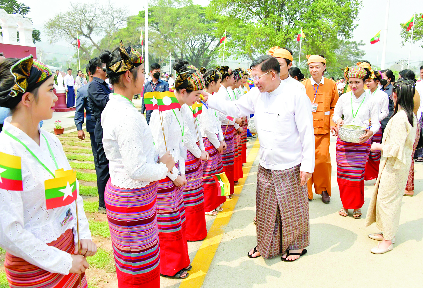 အခမ်းအနားအပြီးတွင် နိုင်ငံတော်စီမံအုပ်ချုပ်ရေးကောင်စီဥက္ကဋ္ဌ နိုင်ငံတော်ဝန်ကြီးချုပ်နှင့် ဇနီး၊ အဖွဲ့ဝင်များသည် ဌာနဆိုင်ရာတာဝန်ရှိသူများ၊ ပြည်သူ့စစ်အဖွဲ့ဝင်များနှင့် ဒေသခံတိုင်းရင်းသားပြည်သူများကို မြန်မာ့ရိုးရာအတာသင်္ကြန်ရေများပက်ဖျန်း၍ နှစ်သစ်ကိုအတူတကွ ရင်းနှီးနွေးထွေးစွာကြိုဆိုခဲ့ကြသည်။ ယင်းနောက် နိုင်ငံတော်စီမံအုပ်ချုပ်ရေးကောင်စီဥက္ကဋ္ဌ နိုင်ငံတော်ဝန်ကြီးချုပ်နှင့်ဇနီး၊ အဖွဲ့ဝင်များ ပြန်လည်ထွက်ခွာရာ ဌာနဆိုင်ရာတာဝန်ရှိသူများနှင့် ဒေသခံတိုင်းရင်းသား ပြည်သူများက ရင်းရင်းနှီးနှီး လက်ပြနှုတ်ဆက်ခဲ့ကြသည်။ (Audio ဖောက်ရန်)