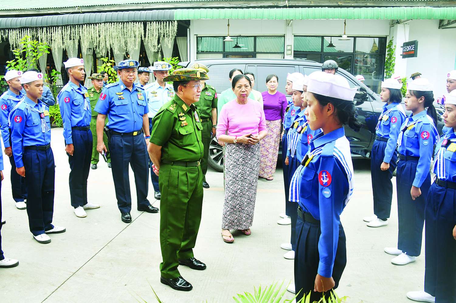 ယင်းနောက် နိုင်ငံတော်စီမံအုပ်ချုပ်ရေးကောင်စီဥက္ကဋ္ဌ တပ်မတော်ကာကွယ်ရေးဦးစီးချုပ်နှင့် ဇနီး၊ အဖွဲ့ဝင်များသည် ကျိုင်းတုံမြို့ နောင်တုံကန်အတွင်း၌ လေ့ကျင့်ရေးဆောင်ရွက်လျက်ရှိသည့် တပ်မတော်(ရေ) ရေကြောင်းလူငယ်အခြေခံသင်တန်း ကျိုင်းတုံစခန်းမှ သင်တန်းသား သင်တန်းသူများကို သွားရောက်တွေ့ဆုံ အားပေးစကားပြောကြားသည်။