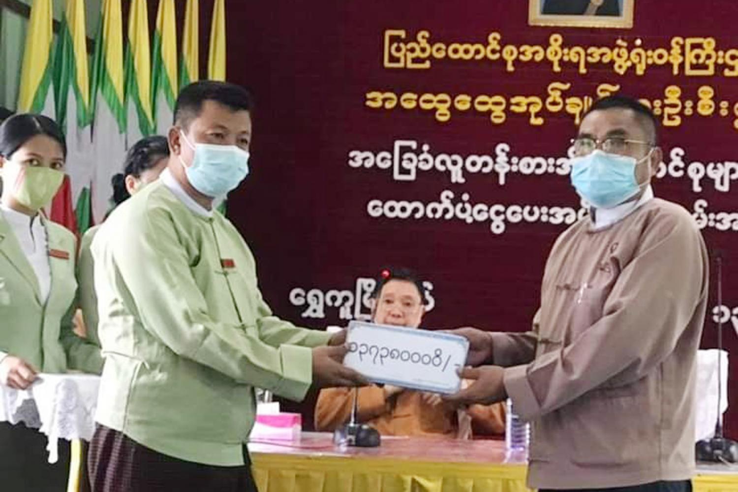 ယင်းနောက် ရွှေကူမြို့နယ်အတွင်း ပုံမှန်ဝင်ငွေမရှိသော အခြေခံလူတန်းစာ အိမ်ထောင်စု (၇၁၁၉)စု အတွက် နိုင်ငံတော်မှ အိမ်ထောင်စု(၁)စုလျှင် ကျပ်(၂၀၀၀၀)ကျပ်နှုန်းဖြင့် စုစုပေါင်း (၁၄၂၃၈၀၀၀၀) ကျပ်ကို ဗမာတိုင်းရင်းသားလူမျိူးရေးရာ ဝန်ကြီးတို့က ထောက်ပံ့ပေးအပ်ခဲ့ကြကာ ပုံမှန်ဝင်ငွေမရှိသော အခြေခံလူတန်းစားများကိုယ်စား မြို့နယ်အုပ်ချုပ်ရေးမှူး ဦးတိုးတိုးဝင်းက လက်ခံရယူပြီး ရေလဲကျေးရွာ အုပ်ချုပ်ရေးမှူး ဦးဝင်းမင်းသန်းမှ ပုံမှန်ဝင်ငွေ မရှိသော အခြေခံလူတန်းစားများ ကိုယ်စား ကျေးဇူးတင်စကား ပြန်လည် ပြောကြားခဲ့ကြောင်း သိရသည်။