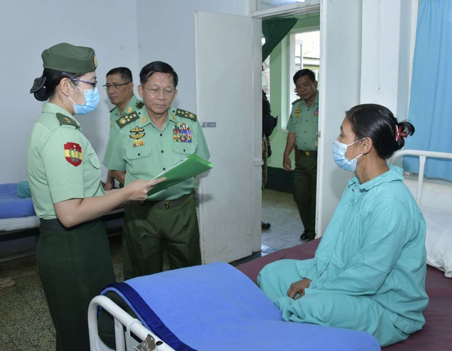 ယနေ့နံနက်ပိုင်းတွင်လည်း နိုင်ငံတော်စီမံအုပ်ချုပ်ရေးကောင်စီဥက္ကဋ္ဌ တပ်မတော်ကာကွယ်ရေးဦးစီးချုပ်နှင့်အဖွဲ့ဝင်များသည် ရှမ်းပြည်နယ်(တောင်ပိုင်း)၊ တောင်ကြီးမြို့ရှိ နယ်မြေခံတပ်မတော်ဆေးရုံသို့သွားရောက်၍ ဆေးရုံတက်ရောက်ကုသမှုခံယူ လျက်ရှိသည့် အရာရှိ၊ စစ်သည်၊ မိသားစုဝင်များ၊ မြန်မာနိုင်ငံရဲတပ်ဖွဲ့ဝင်များ၏ ကျန်းမာရေးအခြေအနေများကို တစ်ဦးချင်းရင်းရင်းနှီးနှီးမေးမြန်း အားပေးစကားပြောကြားကာ စားသောက်ဖွယ်ရာပစ္စည်းများပေးအပ်ခဲ့ကြောင်း သတင်းရရှိသည်။