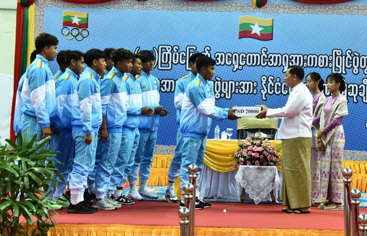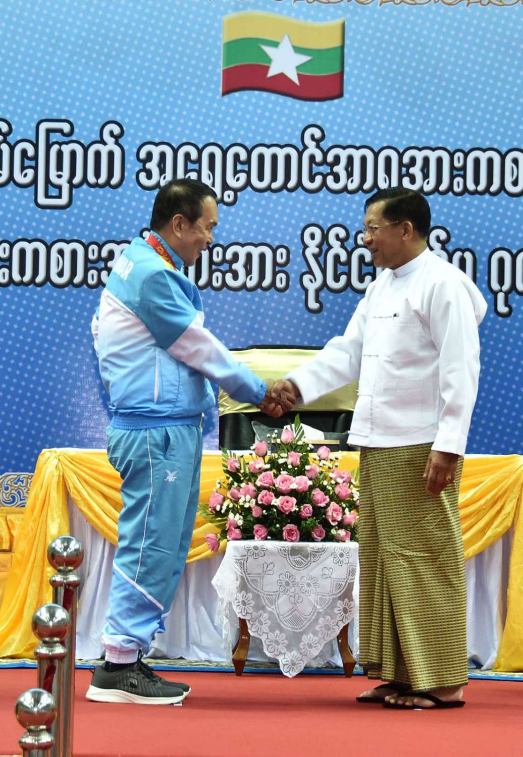 ထို့နောက် နိုင်ငံတော်စီမံအုပ်ချုပ်ရေးကောင်စီဥက္ကဋ္ဌ နိုင်ငံတော်ဝန်ကြီးချုပ်နှင့် အဖွဲ့ဝင်များသည် နိုင်ငံ့ဂုဏ်ဆောင်အားကစားသမားများနှင့် နည်းပြများကို ရင်းရင်းနှီးနှီး နှုတ်ဆက်ခဲ့သည်။
