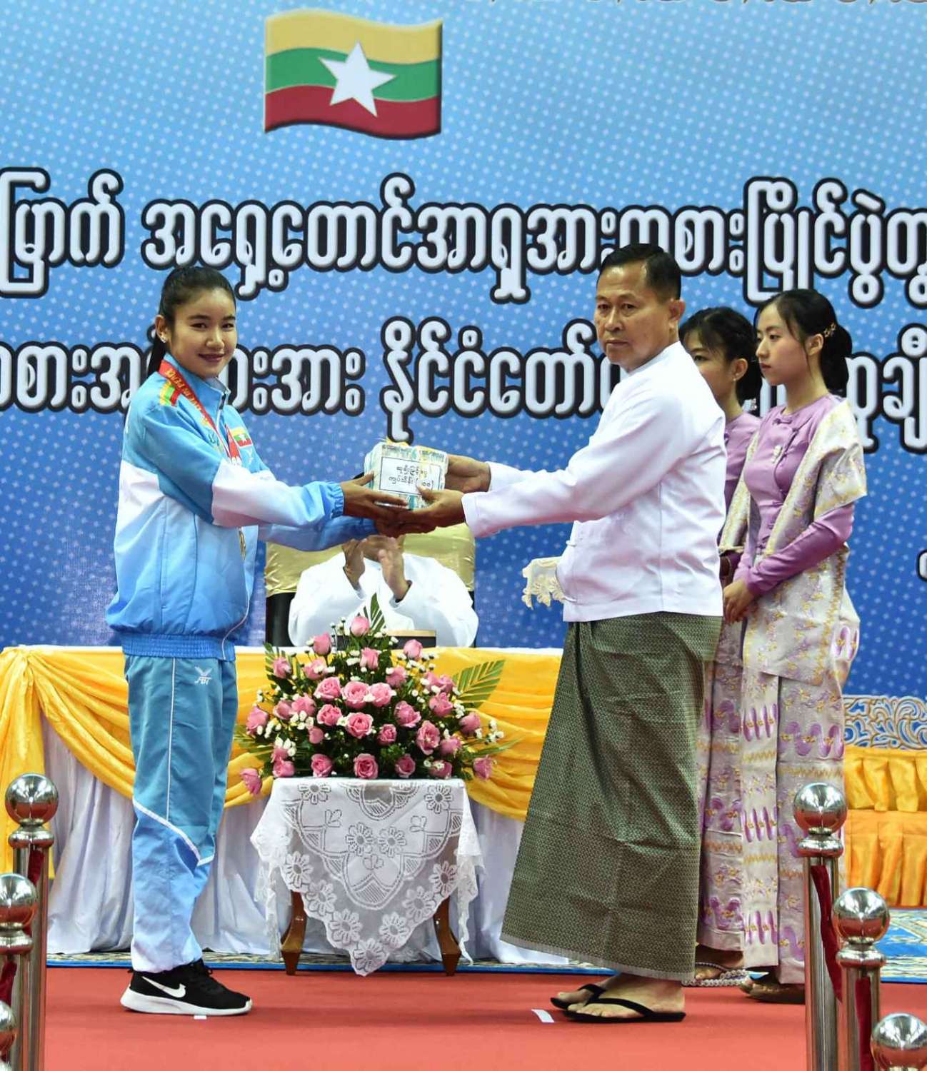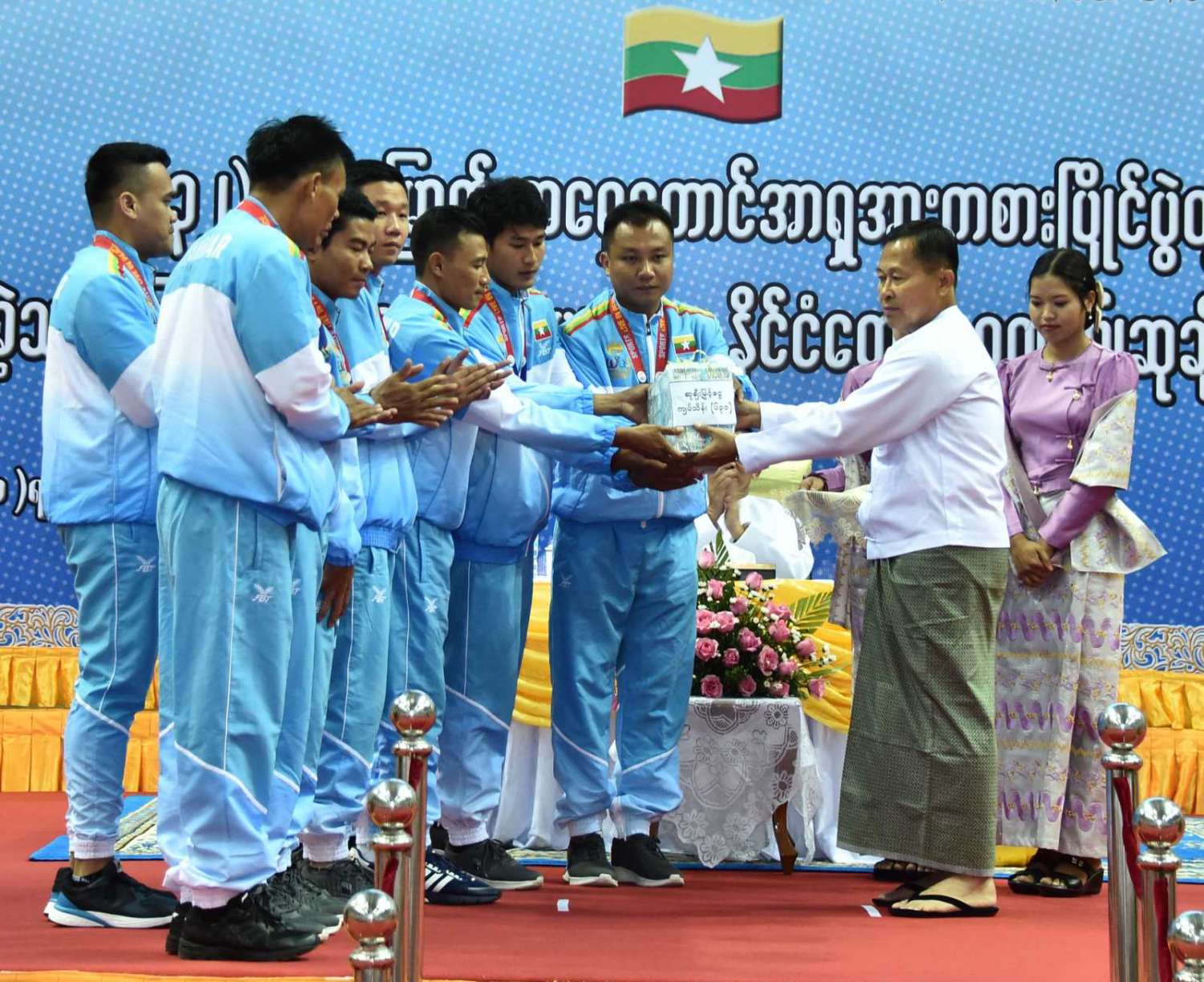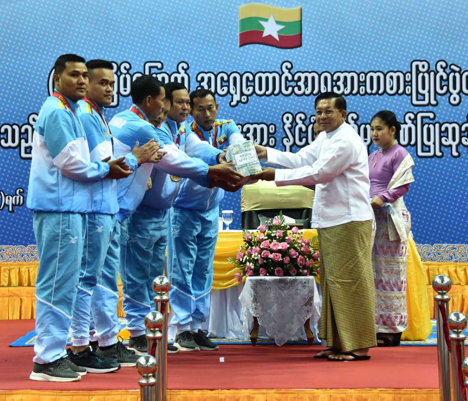 ထို့နောက် (၃၂)ကြိမ်မြောက် အရှေ့တောင်အာရှ အားကစားပြိုင်ပွဲတွင် ဆုတံဆိပ်ရရှိခဲ့သည့် နိုင်ငံ့ဂုဏ်ဆောင် ဆုရအားကစားသမားများ၊ နည်းပြများနှင့် အုပ်ချုပ်သူများကို ဂုဏ်ပြုဆုငွေများ ပေးအပ်ချီးမြှင့်ရာ နိုင်ငံတော်စီမံအုပ်ချုပ်ရေးကောင်စီဥက္ကဋ္ဌ နိုင်ငံတော်ဝန်ကြီးချုပ်က ရွှေတံဆိပ်ဆုရရှိခဲ့ကြသည့် ဗိုဗီနမ်အားကစားနည်းမှ မောင်အိုက်စိုးလင်း၊ မခိုင်ဝါဖူးနှင့် မမေဟန်နီအောင်လွင်၊ မောင်မနားကွီးနှင့် မောင်တင်ထူးဇော်၊ မောင်အောင်ခိုင်လင်း၊ မောင်ဟိန်းထက်အောင်၊ မောင်ကျော်သူစိုးအောင်၊ မောင်ရာဇာထွန်း၊ ဗိုဗီနမ် (ခွန်ဘိုကာတာ) ကစားနည်းမှ မောင်ပိုင်ဇေယျာဖြိုး၊ မောင်အံ့ဘွယ်ငြိမ်း၊ မနီလာစိုးဦး၊ ဗိုဗီနမ်(အားနစ်) ကစားနည်းမှ မောင်စည်သူမောင်၊ မောင်ဇော်သက်၊ မောင်ရဲဇော်မိုး၊ မောင်မျိုးထွန်းအံ့၊ ခြင်းလုံးအားကစားနည်းမှ Same Stroke Event-2 အမျိုးသမီးအသင်း၊ Linking (Preliminary) Event-3 အမျိုးသား၊ အမျိုးသမီးအသင်း၊ Non Repetition Secondary Event-4 အမျိုးသားအသင်း၊ Non Repetition Secondary Event-4 အမျိုးသမီးအသင်း၊ ပိုက်ကျော်ခြင်း အားကစားနည်း၊ ကွင်းသွင်းကစားနည်းမှ အမျိုးသားအသင်း၊ ကွင်းသွင်းခြင်းကစားနည်းမှ အမျိုးသမီးအသင်း၊ ဘိလိယက်/စနူကာ အားကစားနည်းမှ ဦးပေါက်စ၊ မောင်မောင် (ခ) ဘုန်းမြင့်ကျော် (ကိုယ်စား) အားကစားသမားတစ်ဦး၊ မောင်သော်ဇင်ထက်၊ ဝူရှူးအားကစားနည်းမှ မစန္ဒီဦး၊ ရိုးရာလှေ အသက် (၂၄) နှစ်အောက် အမျိုးသား ငါးယောက်လှော် မီတာ ၂၅၀ အားကစား အသင်း၊ တိုက်ကွမ်ဒို အားကစားနည်းမှ မောင်ကျော်မင်းနိုင်၊ အလေးမအားကစားနည်းမှ မဇင်မေဦး၊ ပီတန်းအားကစားနည်းမှ မခင်ချယ်ရီသက်တို့အား ဂုဏ်ပြုချီးမြှင့်ငွေများ ပေးအပ်ချီးမြှင့်သည်။