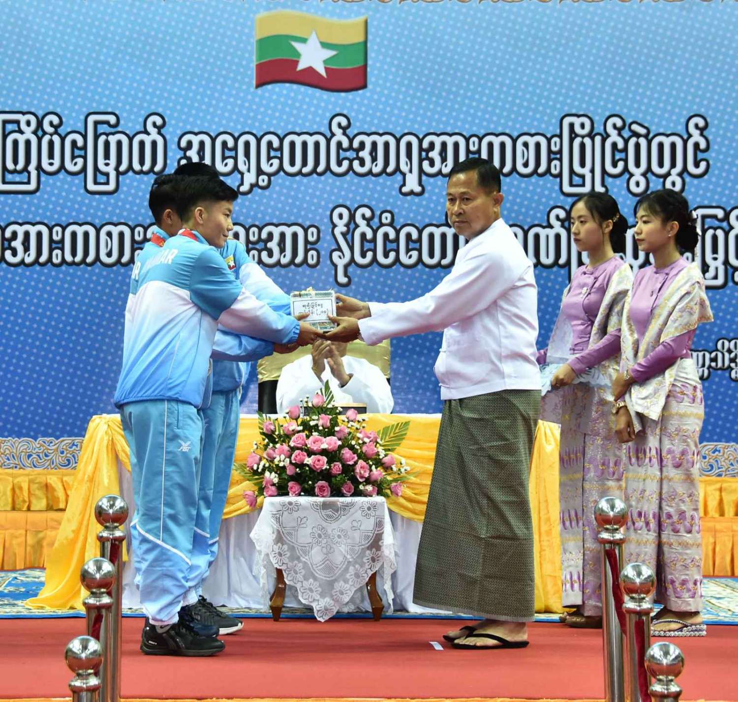 ဆက်လက်၍ ကောင်စီတွဲဖက်အတွင်းရေးမှူး ဒုတိယဗိုလ်ချုပ်ကြီး ရဲဝင်းဦး၊ နိုင်ငံတော်စီမံအုပ်ချုပ်ရေးကောင်စီဝင်များဖြစ်ကြသည့် ဗိုလ်ချုပ်ကြီး မြထွန်းဦး၊ ဒုတိယဗိုလ်ချုပ်ကြီး မိုးမြင့်ထွန်း၊ ဒုတိယဗိုလ်ချုပ်ကြီး စိုးထွဋ်၊ ဒေါ်ဒွဲဘူ၊ ပိုးရယ်အောင်သိန်း၊ မန်းငြိမ်းမောင်၊ ဒေါက်တာမှုထန်၊ ဒေါက်တာ အောင်ကျော်မင်း၊ ဒေါက်တာကျော်ထွန်း၊ ခွန်စံလွင်၊ ဦးရွှေကြိမ်းနှင့် ဦးရန်ကျော်၊ ပြည်ထောင်စုဝန်ကြီးများ ဖြစ်ကြသည့် ဦးဝင်းရှိန်၊ ဒေါက်တာညွန့်ဖေ၊ ဦးမင်းသိန်းဇံ၊ ညှိနှိုင်းကွပ်ကဲရေးမှူး (ကြည်း၊ ရေ၊ လေ) ဗိုလ်ချုပ်ကြီး မောင်မောင်အေး၊ ကာကွယ်ရေးဦးစီးချုပ် (ရေ) ဗိုလ်ချုပ်ကြီး မိုးအောင်၊ ကာကွယ်ရေးဦးစီးချုပ် (လေ) ဗိုလ်ချုပ်ကြီး ထွန်းအောင်နှင့် ကာကွယ်ရေးဦးစီးချုပ်ရုံးမှ တပ်မတော်အရာရှိကြီးများက ခြင်းလုံးအားကစားနည်း၊ ရိုးရာလှေ၊ ဝူရှူးအားကစားနည်း၊ ခွန်ခမာအားကစားနည်း၊ ဂျူဒိုအားကစားနည်း၊ ဘောလုံးအားကစားနည်း၊ ကြက်တောင်၊ ဗိုဗီနမ်အားကစားနည်း၊ ဘိလိယက်/စနူကာ၊ တိုက်ကွမ်ဒိုအားကစားနည်း၊ အလေးမအားကစားနည်း၊ လက်ဝှေ့အားကစားနည်း၊ စစ်တုရင်အားကစားနည်း၊ ပြေးခုန်ပြစ်အားကစားနည်း၊ ခရစ်ကတ်အားကစားနည်း၊ E Sports အားကစားနည်းတို့တွင် ငွေတံဆိပ်နှင့် ကြေးတံဆိပ်ဆုရရှိခဲ့ကြသည့် နိုင်ငံ့ဂုဏ်ဆောင် ဆုရအားကစားသမားများ၊ နည်းပြများနှင့် အုပ်ချုပ်သူများကို ဂုဏ်ပြုဆုငွေများ အသီးသီးပေးအပ် ချီးမြှင့်ကြသည်။