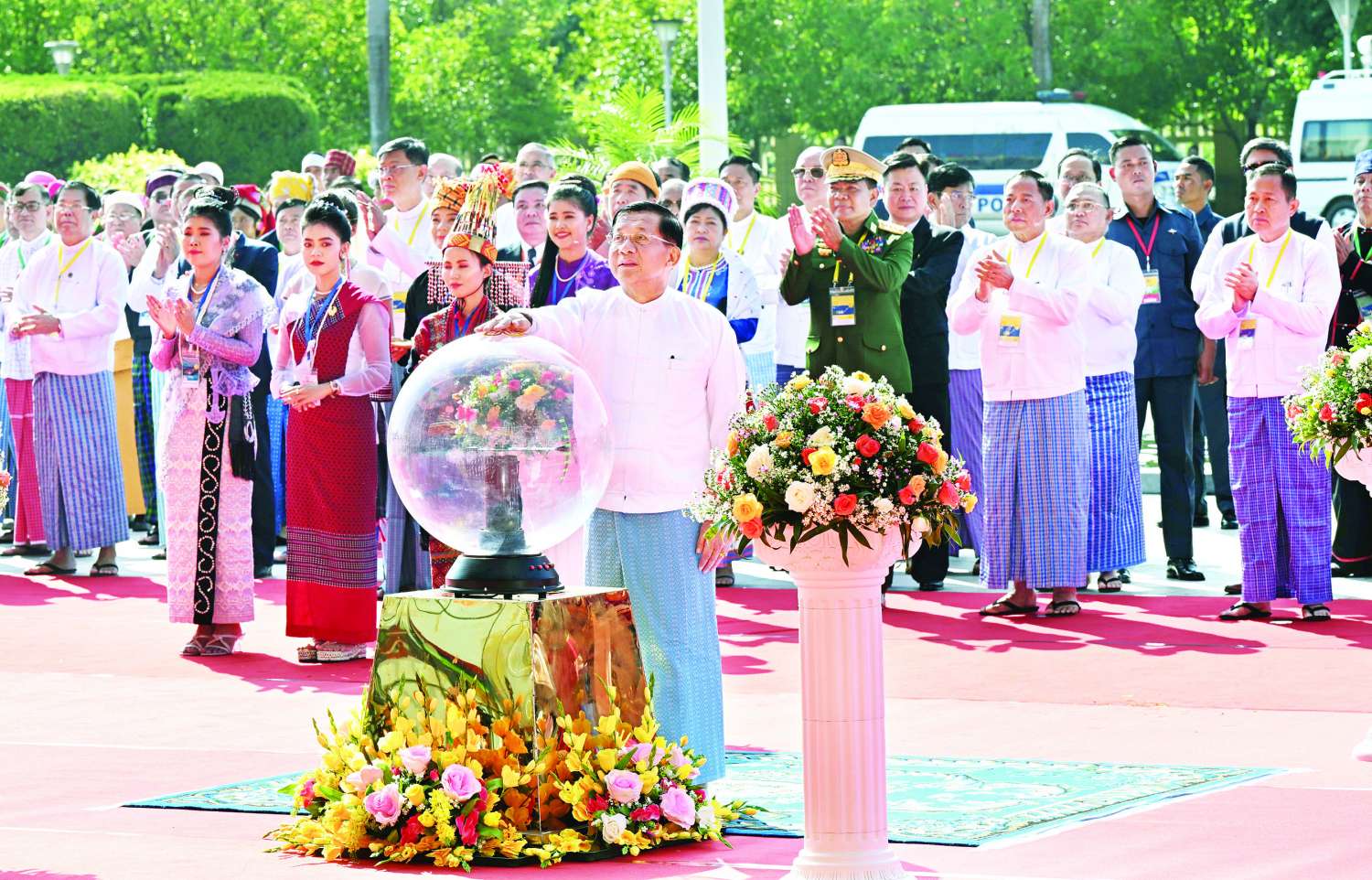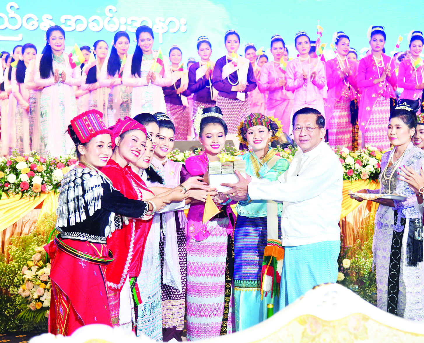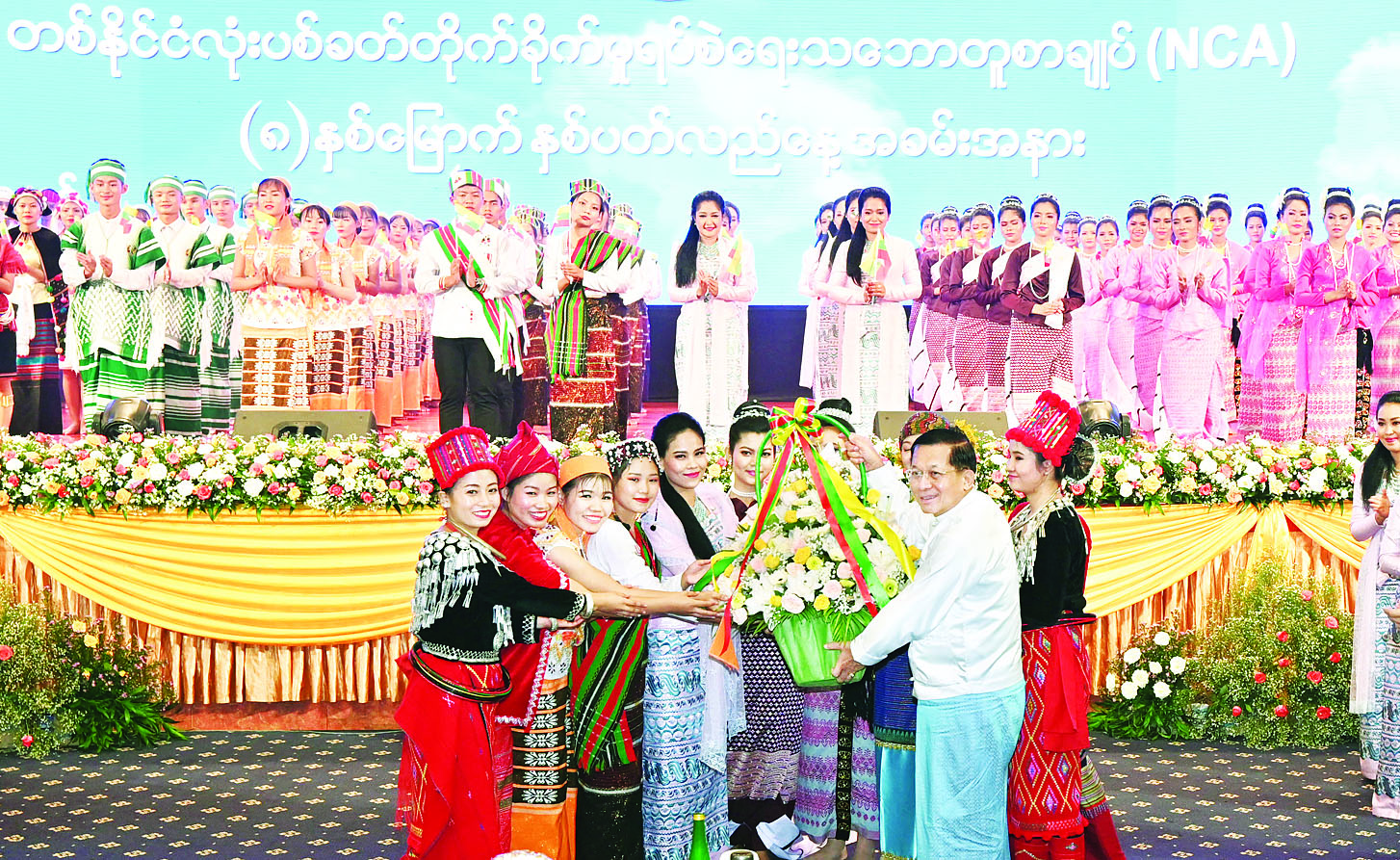 ထို့နောက် နိုင်ငံတော်စီမံအုပ်ချုပ်ရေးကောင်စီဥက္ကဋ္ဌ နိုင်ငံတော်ဝန်ကြီးချုပ် အမျိုးသားစည်းလုံးညီညွတ်ရေးနှင့် ငြိမ်းချမ်းရေးဖော်ဆောင်မှု ဗဟိုကော်မတီဥက္ကဋ္ဌက ပြန်ကြားရေးဝန်ကြီးဌာန မြန်မာ့အသံနှင့်ရုပ်မြင်သံကြား၊ သာသနာရေးနှင့်ယဉ်ကျေးမှုဝန်ကြီးဌာန၊ အနုပညာဦးစီးဌာနတို့မှ အကအဖွဲ့များနှင့် တိုင်းရင်းသားအကအဖွဲ့များကို “ငြိမ်းချမ်းရေး ဂုဏ်ပြုပန်းခြင်း” နှင့် ဂုဏ်ပြုချီးမြှင့်ငွေများ ပေးအပ်ချီးမြှင့်ပြီး တိုင်းရင်းသားအကအဖွဲ့များနှင့်အတူ စုပေါင်းမှတ်တမ်းတင် ဓာတ်ပုံရိုက်သည်။