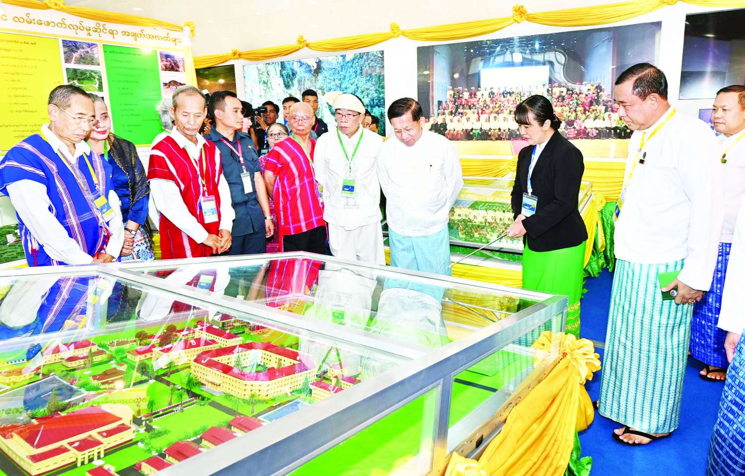 ထို့နောက် နိုင်ငံတော်စီမံအုပ်ချုပ်ရေးကောင်စီဥက္ကဋ္ဌ နိုင်ငံတော်ဝန်ကြီးချုပ် အမျိုးသားစည်းလုံးညီညွတ်ရေးနှင့် ငြိမ်းချမ်းရေးဖော်ဆောင်မှုဗဟိုကော်မတီဥက္ကဋ္ဌနှင့် အခမ်းအနားသို့တက်ရောက်လာသည့် ဧည့်သည်တော်များသည် (MICC-II) Lobby ၌ ခင်းကျင်းပြသထားသည့် တစ်နိုင်ငံလုံးပစ်ခတ်တိုက်ခိုက်မှုရပ်စဲရေးသဘောတူစာချုပ် (NCA) (၈) နှစ်မြောက် နှစ်ပတ်လည်နေ့ အထိမ်းအမှတ် သတင်းစာများကပြောသောငြိမ်းချမ်းရေးသမိုင်း မှတ်တမ်းပြခန်း၊ ငြိမ်းချမ်းရေးကြိုးပမ်းမှုမှတ်တမ်းဓာတ်ပုံများ ပြခန်း၊ နယ်စပ်ရေးရာဝန်ကြီးဌာန ပြခန်း၊ တိုင်းရင်းသားလူမျိုးရေးရာဝန်ကြီးဌာန ပြခန်း၊ မြန်မာ့အသံနှင့်ရုပ်မြင်သံကြား၏ တိုင်းရင်းသားလူမျိုးများရုပ်သံလိုင်းနှင့် မြန်မာ့အသံရေဒီယိုတို့မှ တိုင်းရင်းသားဘာသာများဖြင့် ထုတ်လွှင့်မှု သရုပ်ပြပြခန်း၊ ပြည်ထောင်စုအလှ ထာဝရမှတ်တမ်းဓာတ်ပုံများ ပြခန်းများကို လှည့်လည်ကြည့်ရှုကြသည်။