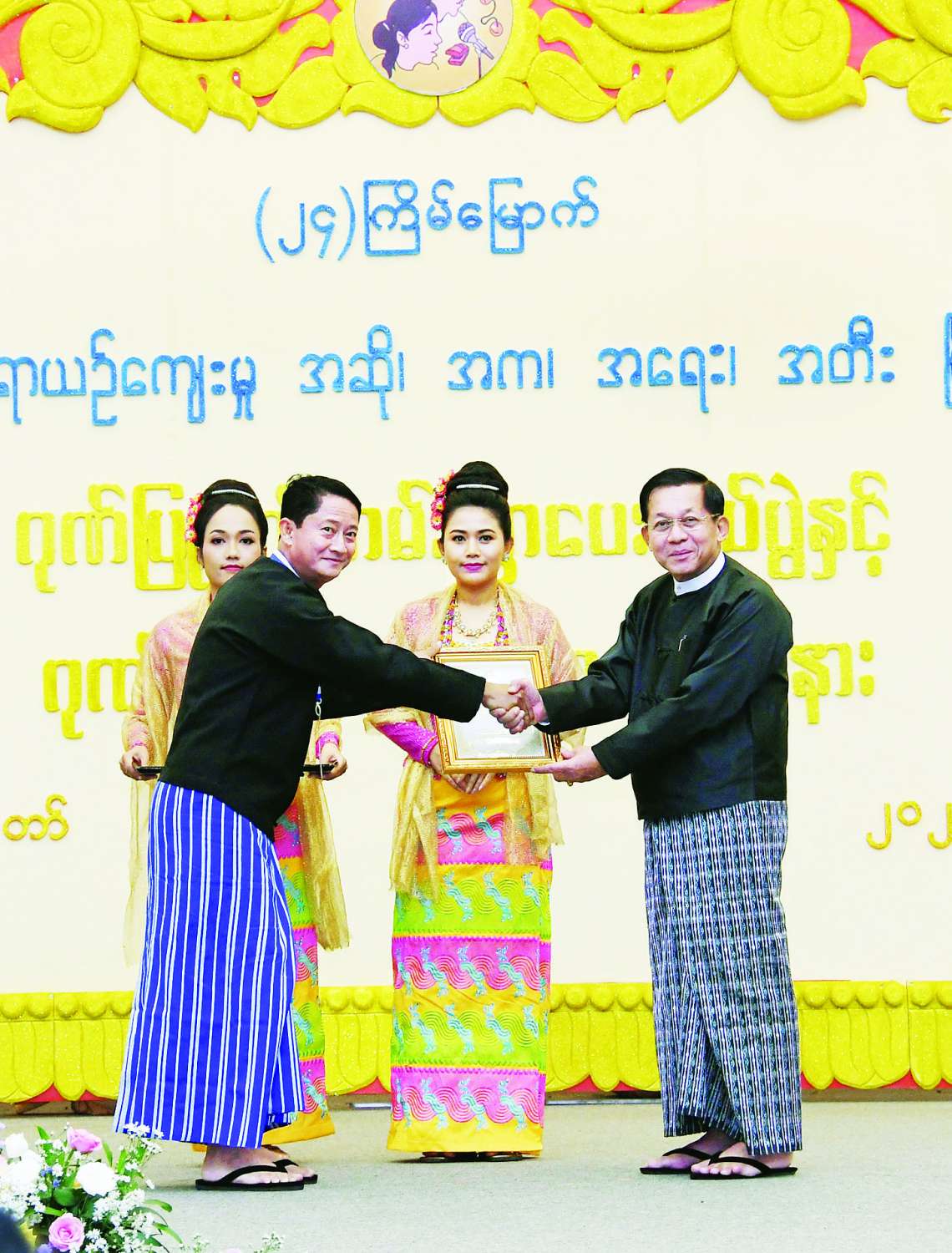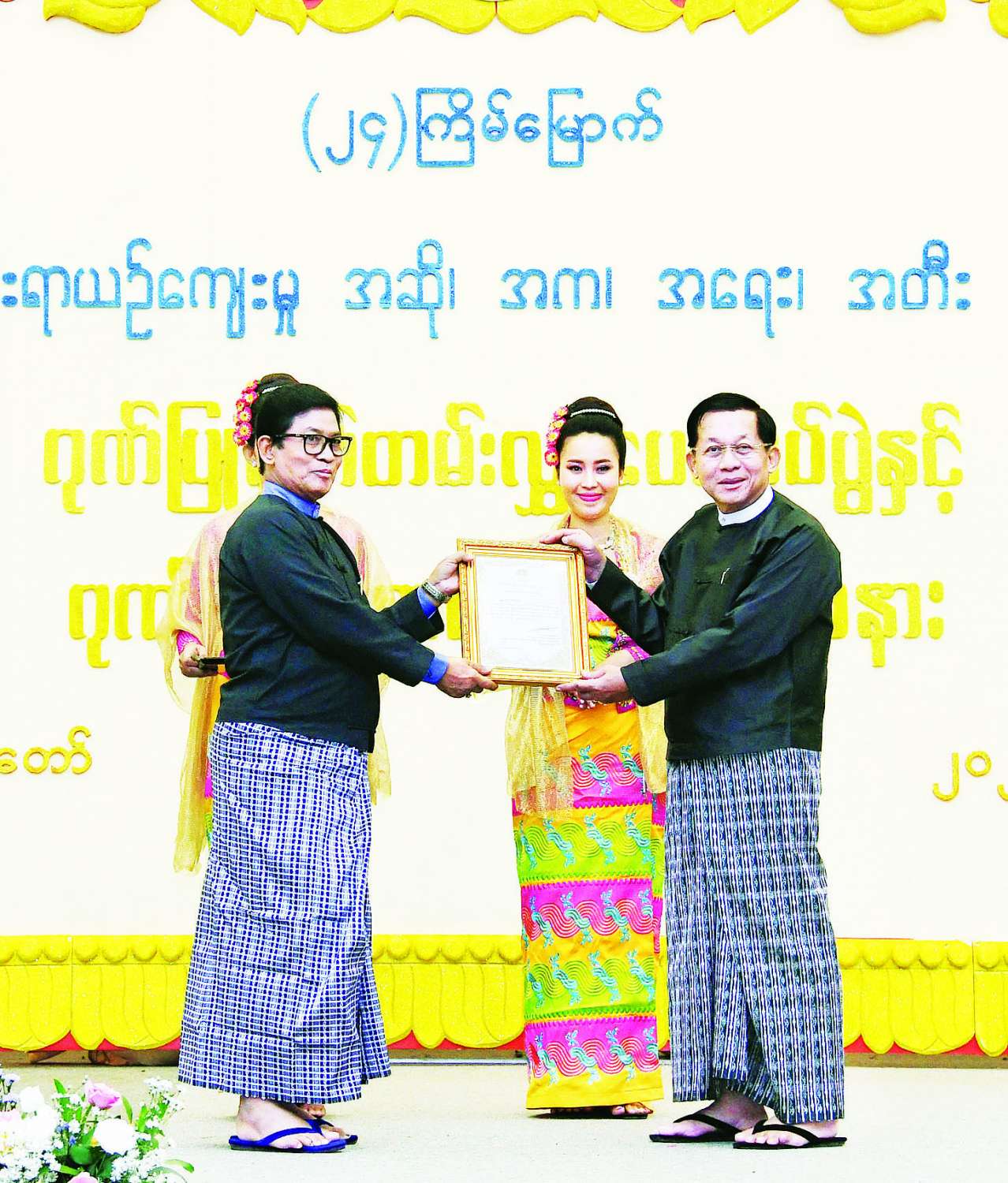 ယင်းနောက် နိုင်ငံတော်စီမံအုပ်ချုပ်ရေးကောင်စီဥက္ကဋ္ဌ နိုင်ငံတော်ဝန်ကြီးချုပ်က အဆိုအကဲဖြတ်လုပ်ငန်းအဖွဲ့ကိုယ်စား ဥက္ကဋ္ဌ ဒေါ်သင်းသင်းမြတ်၊ အကအကဲဖြတ်လုပ်ငန်းအဖွဲ့ကိုယ်စား ဥက္ကဋ္ဌ ဦးအောင်တင်ဝင်း၊ အရေးအကဲဖြတ်လုပ်ငန်းအဖွဲ့ကိုယ်စား ဥက္ကဋ္ဌ ဦးမောင်မောင်လတ်နှင့် အတီးအကဲဖြတ်လုပ်ငန်းအဖွဲ့ကိုယ်စား ဥက္ကဋ္ဌ ဦးအောင်ကိန်း၊ တိုင်းဒေသကြီးနှင့် ပြည်နယ်များမှ အုပ်ချုပ်သူများနှင့် အခမ်းအနားမှူးများကို ဂုဏ်ပြုမှတ်တမ်းလွှာများ ပေးအပ်ချီးမြှင့်သည်။