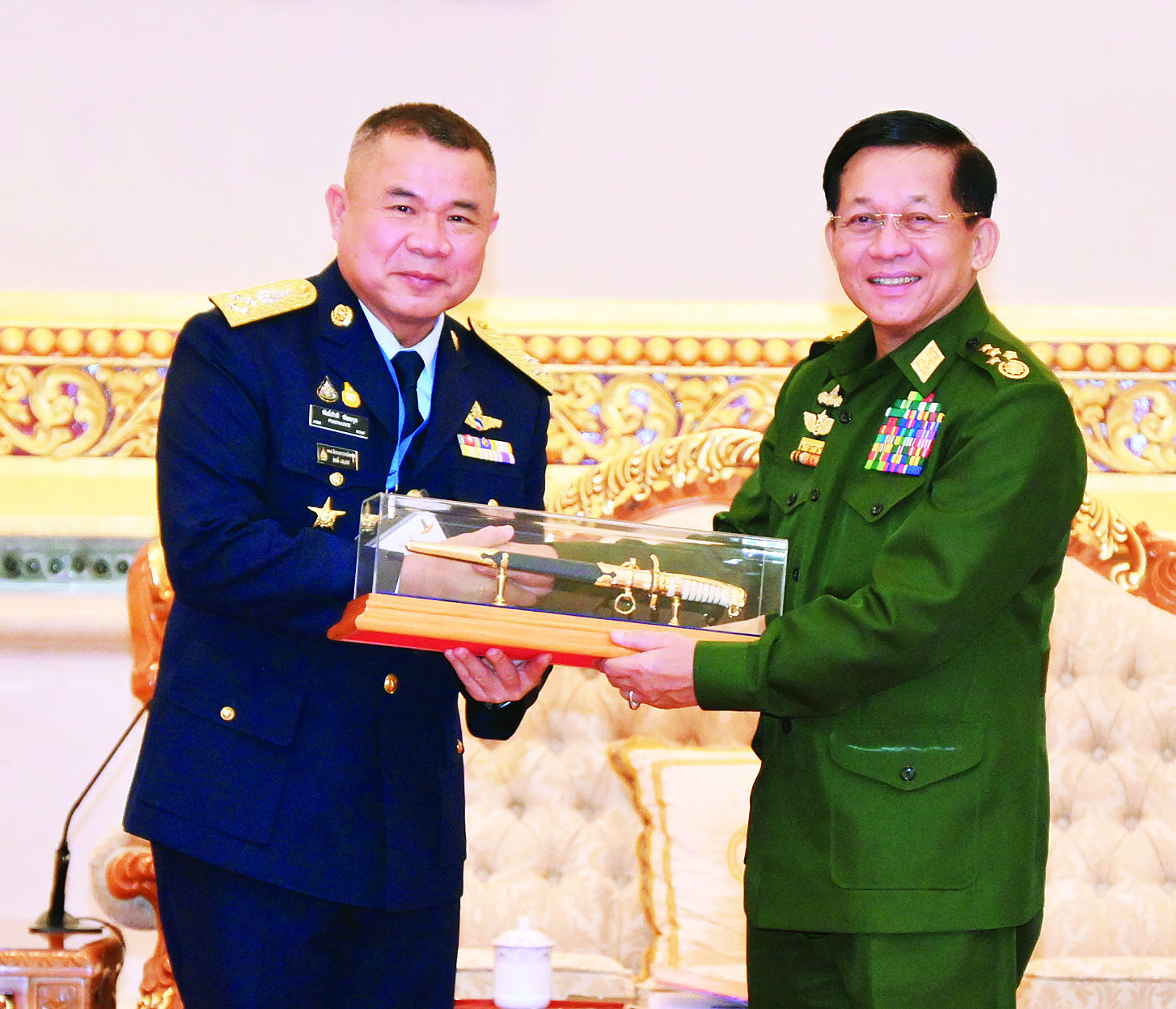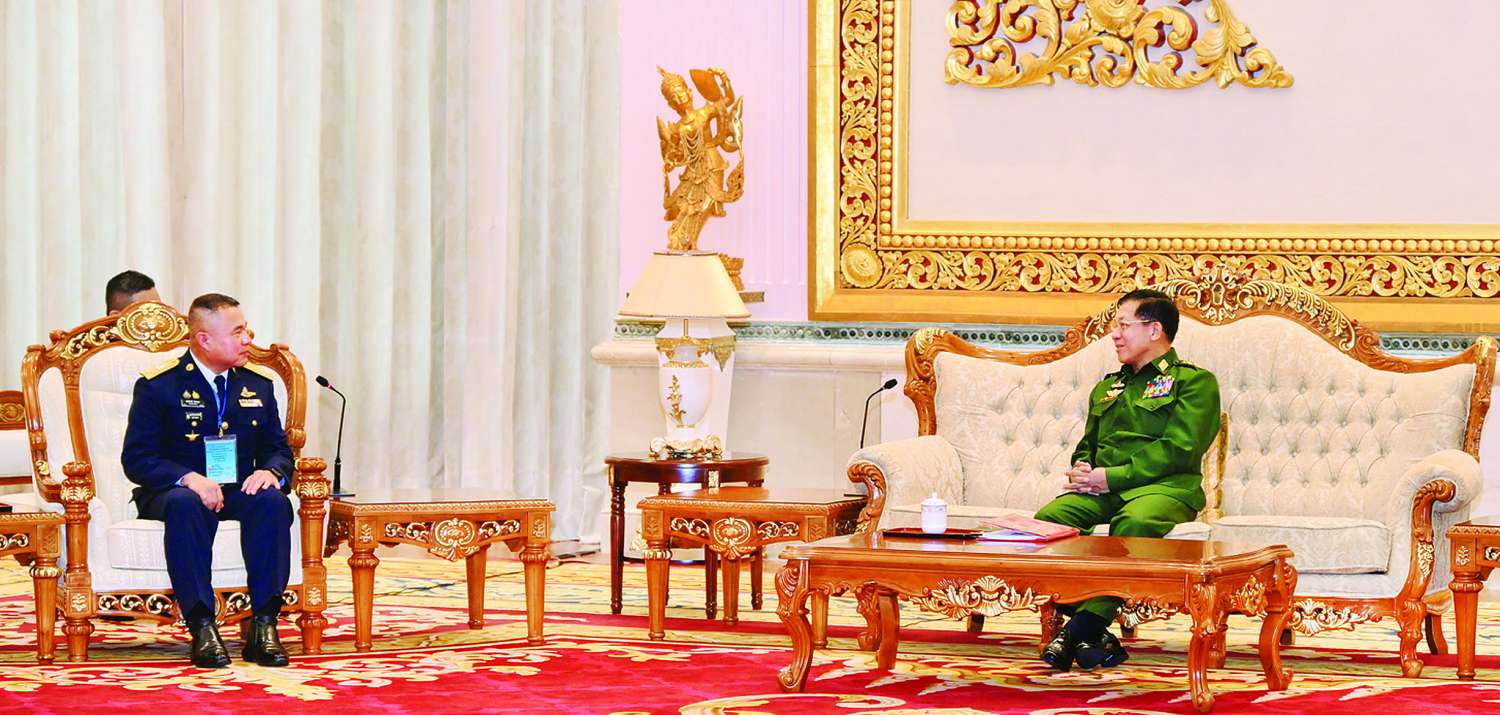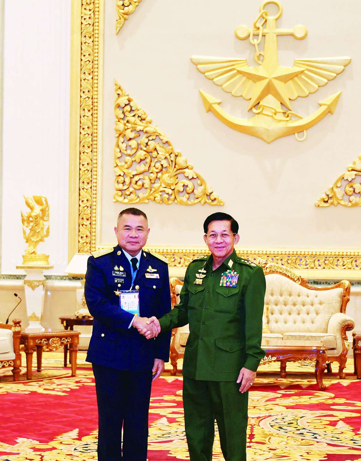 နိုင်ငံတော်စီမံအုပ်ချုပ်ရေးကောင်စီဥက္ကဋ္ဌ တပ်မတော်ကာကွယ်ရေးဦးစီးချုပ် ဗိုလ်ချုပ်မှူးကြီး မင်းအောင်လှိုင် ထိုင်းဘုရင့်လေတပ်ဦးစီးချုပ် ဦးဆောင်သည့် ကိုယ်စားလှယ်အဖွဲ့အား လက်ခံတွေ့ဆုံ