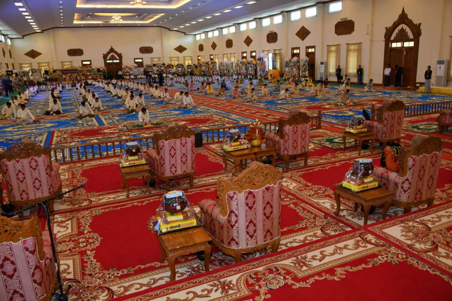 ဦးစွာ နိုင်ငံတော်စီမံအုပ်ချုပ်ရေးကောင်စီဥက္ကဋ္ဌ နိုင်ငံတော်ဝန်ကြီးချုပ်သည် သာသနာ့မဟာဗိမာန်တော်အတွင်းရှိ ဗုဒ္ဓရုပ်ပွားတော်မြတ်အား ဖူးမြော်ကြည်ညို၍ မြသပိတ်ဆွမ်းတော်၊ ပန်း၊ ရေချမ်း၊ ဆီမီးနှင့် သစ်သီးတို့ကို ဆက်ကပ်လှူဒါန်းသည်။