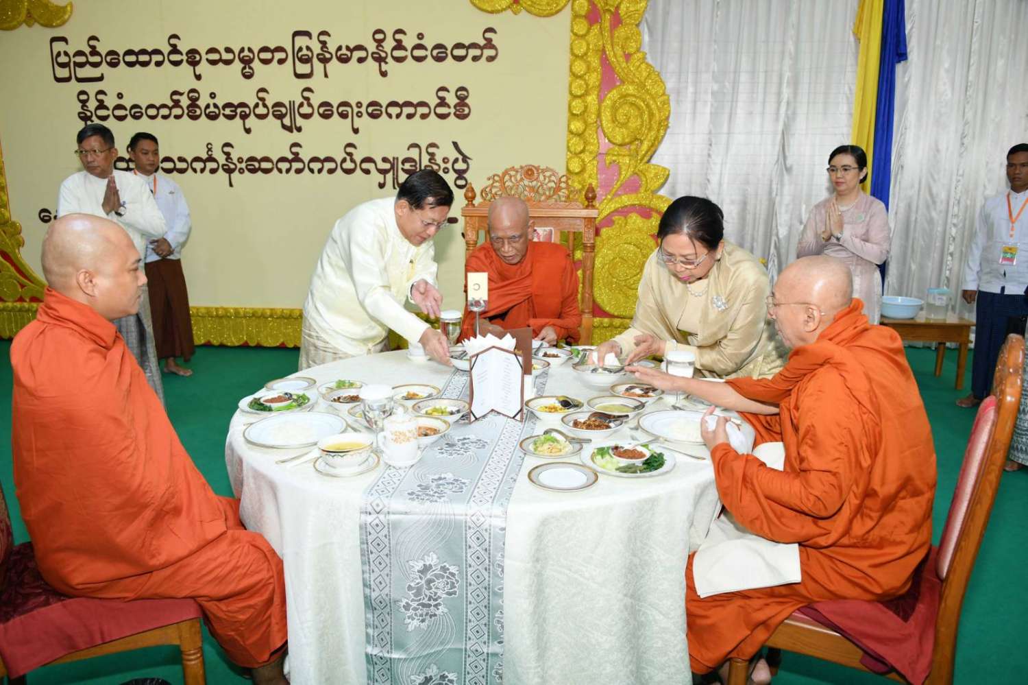 ယင်းနောက် အခမ်းအနားကို “ဗုဒ္ဓသာသနံ စိရံတိဋ္ဌတု” သုံးကြိမ်ရွတ်ဆိုဆုတောင်း၍ အခမ်းအနားကို ရုပ်သိမ်းလိုက်သည်။ အခမ်းအနားအပြီးတွင် သန်လျင်မင်းကျောင်းဆရာတော်ကြီးအမှူးပြုသည့် ဆရာတော်၊ သံဃာတော်များအား နိုင်ငံတော်စီမံအုပ်ချုပ်ရေးကောင်စီဥက္ကဋ္ဌနှင့် ဇနီး၊ ဧည့်ပရိသတ်များက နေ့ဆွမ်း ဆက်ကပ်လှူဒါန်းခဲ့သည်။