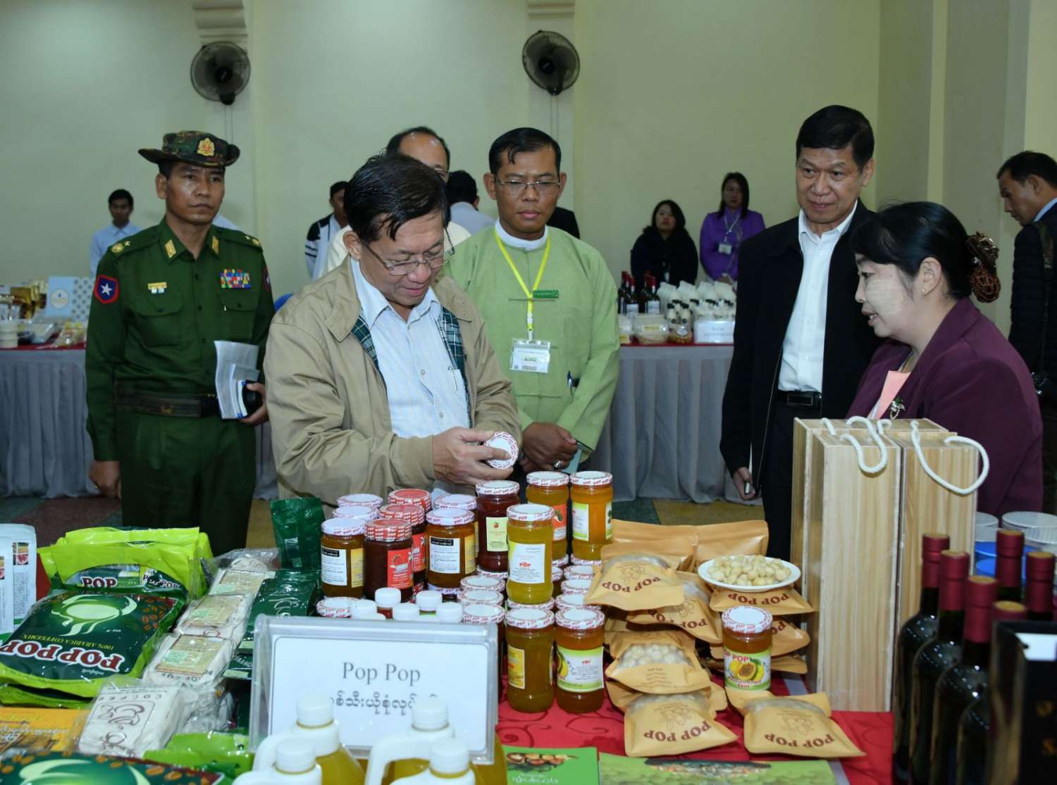 တွေ့ဆုံပွဲအပြီးတွင် နိုင်ငံတော်စီမံအုပ်ချုပ်ရေးကောင်စီဥက္ကဋ္ဌ နိုင်ငံတော်ဝန်ကြီးချုပ်နှင့် အဖွဲ့ဝင်များသည် တက်ရောက်လာကြသည့် ကော်ဖီလုပ်ငန်းရှင်များနှင့် အသေးစား၊ အငယ်စားနှင့် အလတ်စားစီးပွားရေး(MSME) လုပ်ငန်းရှင်များအား ရင်းရင်းနှီးနှီးနှုတ်ဆက်ခဲ့ပြီး ခင်းကျင်းပြသထားသည့် ဒေသထွက်ကော်ဖီထုတ်ကုန်များနှင့် ဒေသထွက် စားသောက်ကုန်ပစ္စည်းများကို  စိတ်ဝင်တစားဖြင့်လေ့လာခဲ့ပြီး ဈေးကွက်ရရှိမှုအခြေအနေများကို မေးမြန်းဆွေးနွေးရာ လုပ်ငန်းအလိုက် တာဝန်ရှိသူများက လိုက်လံရှင်းလင်းတင်ပြခဲ့ကြကြောင်း သတင်းရရှိသည်။