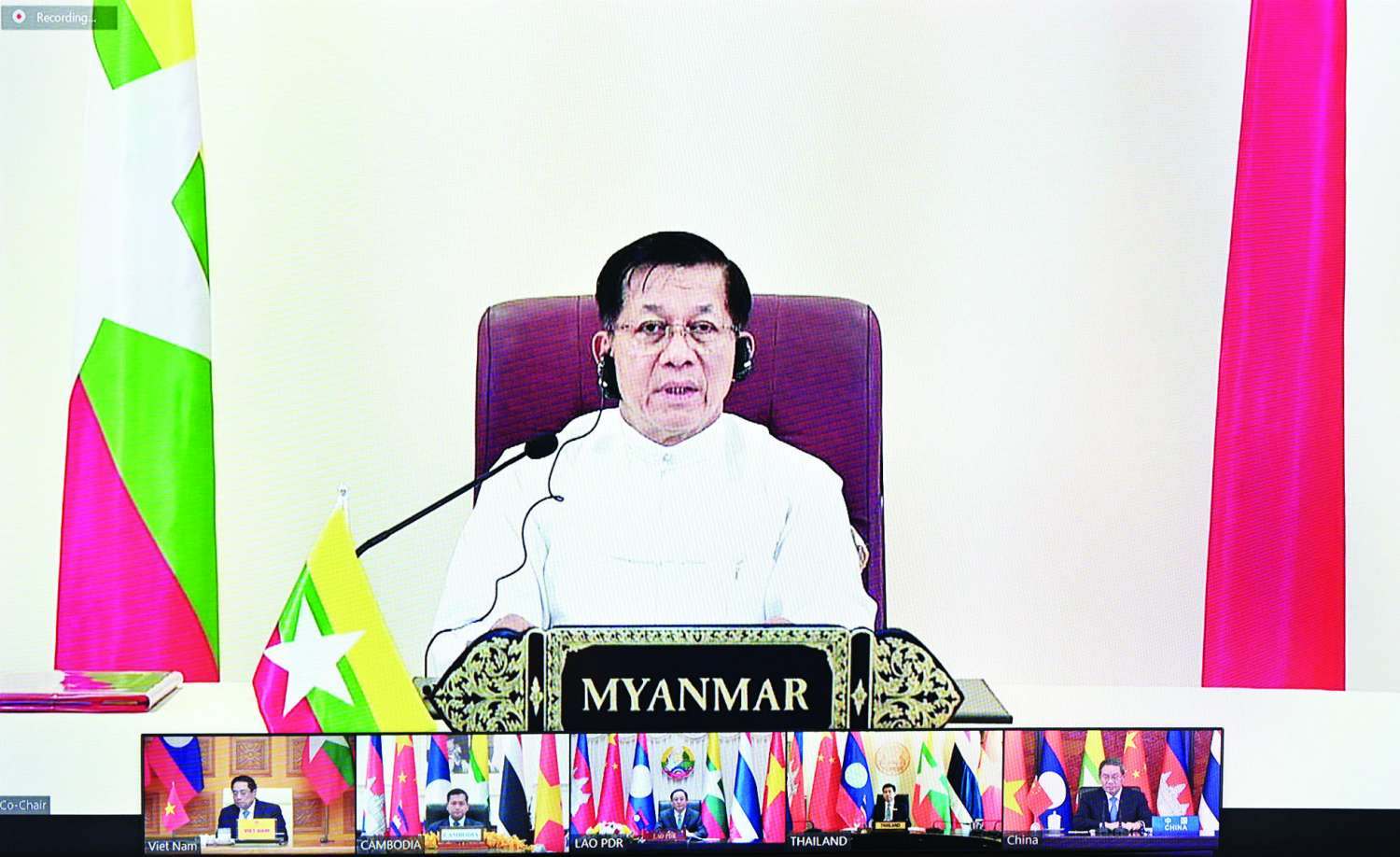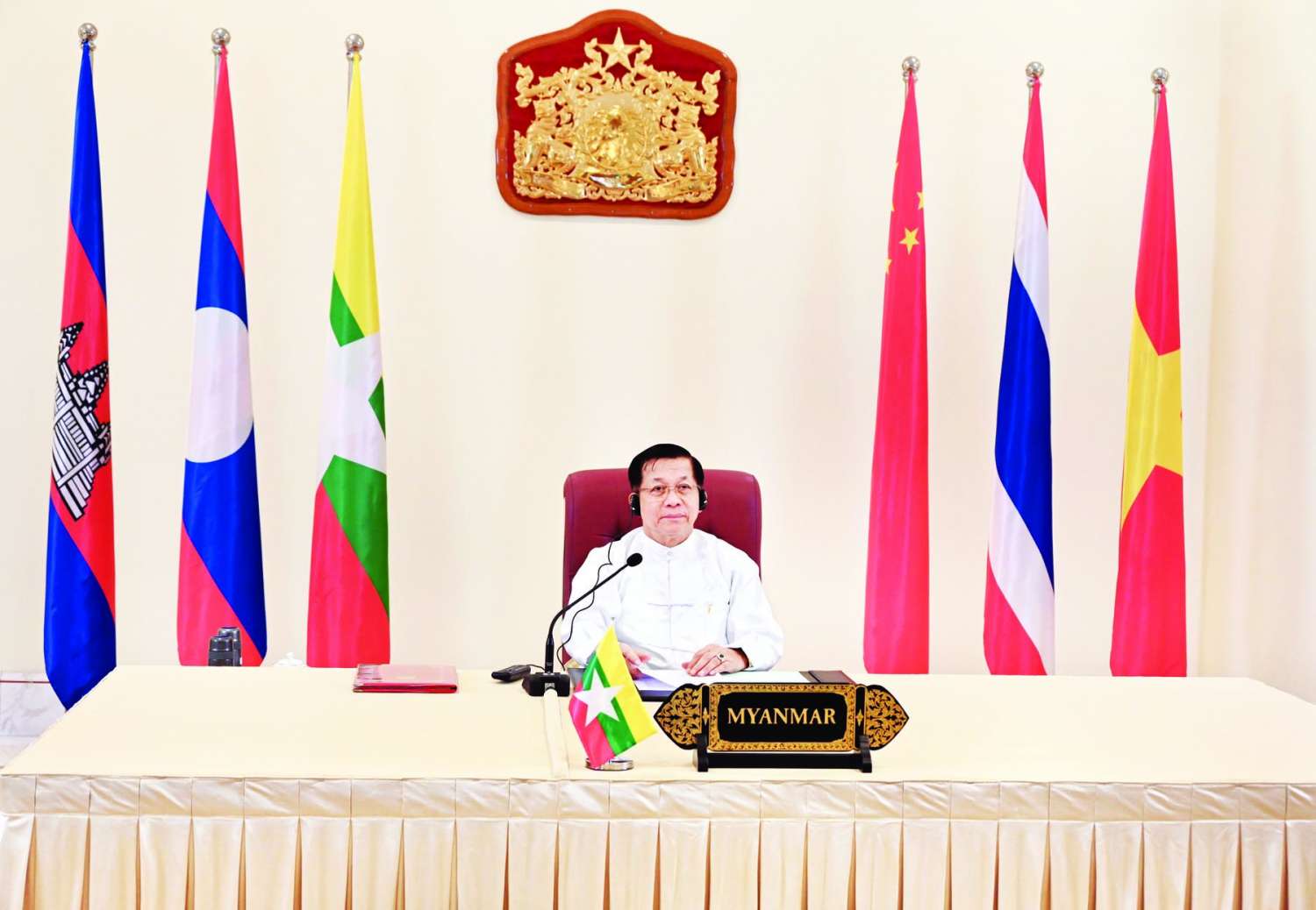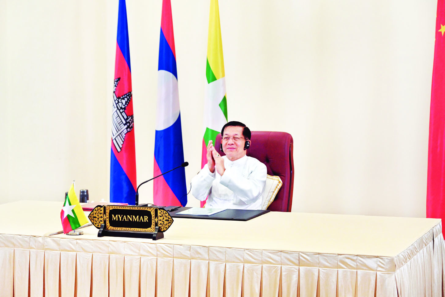 နိုင်ငံတော်စီမံအုပ်ချုပ်ရေးကောင်စီဥက္ကဋ္ဌ နိုင်ငံတော်ဝန်ကြီးချုပ် ဗိုလ်ချုပ်မှူးကြီး မင်းအောင်လှိုင် (၄) ကြိမ်မြောက် မဲခေါင်-လန်ချန်း ပူးပေါင်းဆောင်ရွက်မှု နိုင်ငံ့ခေါင်းဆောင်များ အစည်းအဝေးသို့ ဗီဒီယိုကွန်ဖရင့်ဖြင့် ပါဝင်တက်ရောက်ဆွေးနွေး