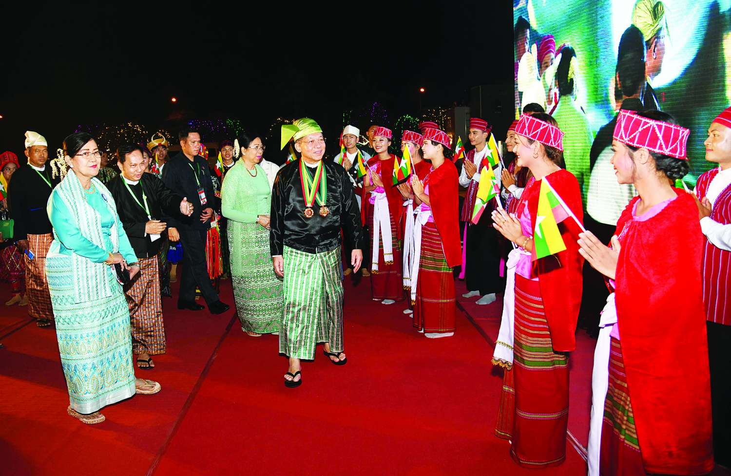 ဦးစွာ နိုင်ငံတော်စီမံအုပ်ချုပ်ရေးကောင်စီဥက္ကဋ္ဌ နိုင်ငံတော်ဝန်ကြီးချုပ် ဗိုလ်ချုပ်မှူးကြီး သတိုးမဟာသရေစည်သူ သတိုးသီရိသုဓမ္မ မင်းအောင်လှိုင်နှင့် ဇနီး ဒေါ်ကြူကြူလှတို့သည် ညနေ ၆ နာရီတွင် ဂုဏ်ပြုညစာစားပွဲအခမ်းအနားကျင်းပမည့် မြို့တော်ခန်းမ ဥပစာရင်ပြင်သို့ ရောက်ရှိကြရာ နိုင်ငံတော်စီမံအုပ်ချုပ်ရေးကောင်စီ ဒုတိယဥက္ကဋ္ဌ ဒုတိယဝန်ကြီးချုပ် ဒုတိယဗိုလ်ချုပ်မှူးကြီး သီရိပျံချီ မဟာသရေစည်သူ စိုးဝင်းနှင့် ဇနီး ဒေါ်သန်းသန်းနွယ်၊ ပြည်ထောင်စု ရွေးကောက်ပွဲကော်မရှင်ဥက္ကဋ္ဌ ဦးကိုကိုနှင့် ဇနီး၊ ပြည်ထောင်စုဝန်ကြီးများနှင့် ဇနီးများ၊ နေပြည်တော်ကောင်စီဥက္ကဋ္ဌ ဦးသန်းထွန်းဦးနှင့် ဇနီးတို့က ကြိုဆိုနှုတ်ဆက်ကြသည်။