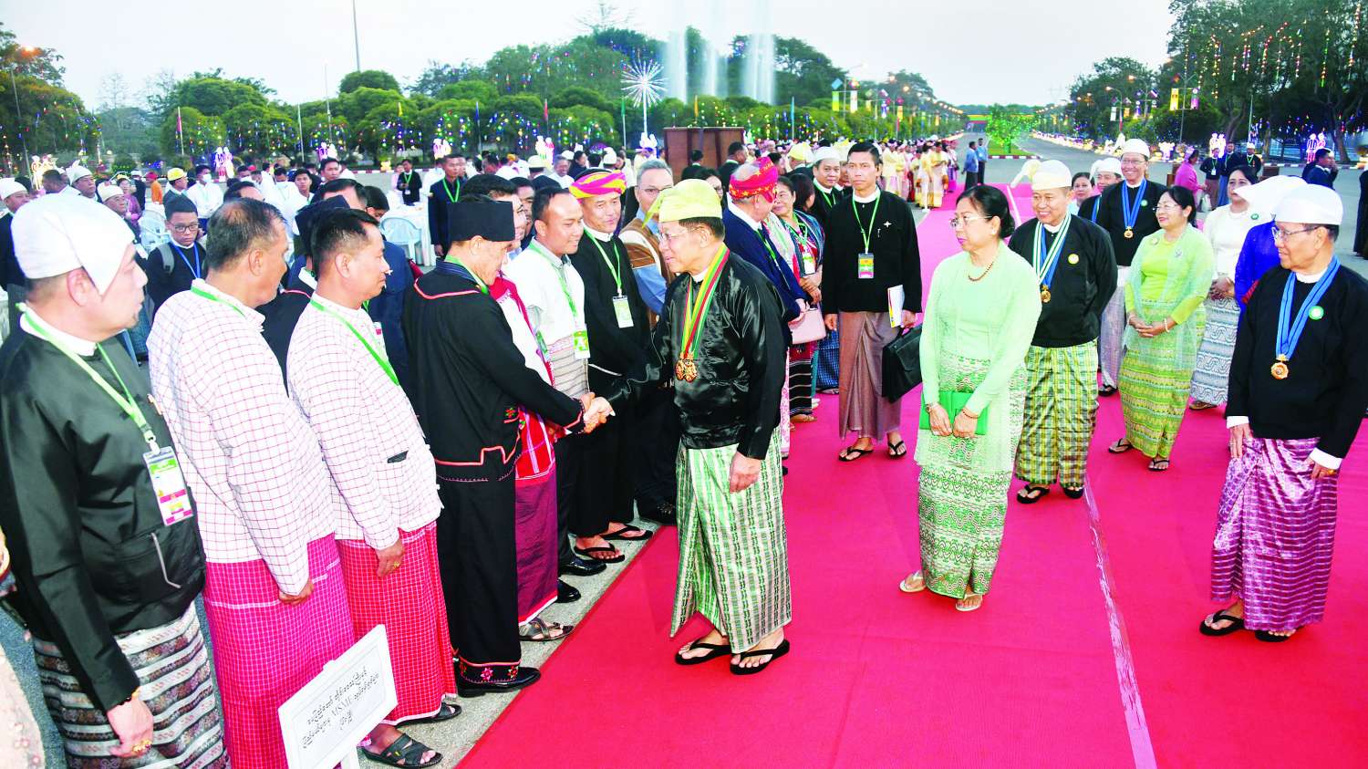 ထို့နောက် နိုင်ငံတော်စီမံအုပ်ချုပ်ရေးကောင်စီဥက္ကဋ္ဌ နိုင်ငံတော်ဝန်ကြီးချုပ်နှင့် ဇနီး၊ ကောင်စီဒုတိယဥက္ကဋ္ဌ ဒုတိယဝန်ကြီးချုပ်နှင့် ဇနီးတို့သည် ဂုဏ်ပြုညစာစားပွဲသို့ တက်ရောက်လာကြသည့် တိုင်းဒေသကြီးနှင့် ပြည်နယ်များမှ တိုင်းရင်းသားရိုးရာယဉ်ကျေးမှုအဖွဲ့များ၊ နိုင်ငံရေးပါတီများမှ ဥက္ကဋ္ဌများနှင့် ကိုယ်စားလှယ်များ၊ NCA စာချုပ် လက်မှတ်ရေးထိုးထားသည့် တိုင်းရင်းသားလက်နက်ကိုင်အဖွဲ့အစည်းများမှ ခေါင်းဆောင်များနှင့် ကိုယ်စားလှယ်များ၊ တိုင်းဒေသကြီးနှင့် ပြည်နယ်များမှ စီးပွားရေးရာဝန်ကြီးများနှင့် တိုင်းရင်းသားလူမျိုးရေးရာဝန်ကြီးများ၊ တိုင်းဒေသကြီးနှင့် ပြည်နယ်များမှ MSME လုပ်ငန်းရှင်များ၊ ကာကွယ်ရေးဦးစီးချုပ်ရုံးမှ အဆင့်မြင့်တပ်မတော်အရာရှိကြီးများနှင့် ဇနီးများ၊ ပြည်ထောင်စုဝန်ကြီးများ၊ ပြည်ထောင်စုအဆင့်ပုဂ္ဂိုလ်များနှင့် ဇနီးများ၊ နိုင်ငံတော်စီမံအုပ်ချုပ်ရေးကောင်စီဝင်များနှင့် ဇနီးများ၊ ကောင်စီအတွင်းရေးမှူးနှင့် ဇနီးတို့ကို ရင်းရင်းနှီးနှီး လိုက်လံနှုတ်ဆက်ကြသည်။