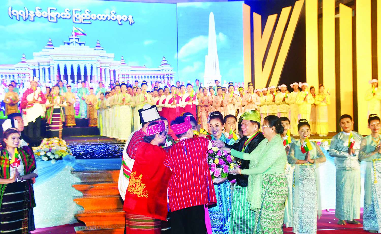 ထိုသို့ဖျော်ဖြေတင်ဆက်ရာတွင် သာသနာရေးနှင့်ယဉ်ကျေးမှုဝန်ကြီးဌာန၊ အနုပညာဦးစီးဌာနမှ အနုပညာရှင်များက ပြည်ထောင်စုတေးသရုပ်ဖော်ဖြင့်လည်းကောင်း၊ ကချင်တိုင်းရင်းသားရိုးရာအကအဖွဲ့၊ ကယားတိုင်းရင်းသားရိုးရာအကအဖွဲ့၊ ကရင်တိုင်းရင်းသားရိုးရာအကအဖွဲ့၊ ချင်းတိုင်းရင်းသားရိုးရာအကအဖွဲ့၊ ဧရာဝတီတိုင်းဒေသကြီး ဗမာတိုင်းရင်းသားရိုးရာအကအဖွဲ့၊ မွန်တိုင်းရင်းသားရိုးရာအကအဖွဲ့၊ ရခိုင်တိုင်းရင်းသားရိုးရာအကအဖွဲ့၊ ရှမ်းတိုင်းရင်းသားရိုးရာအကအဖွဲ့တို့က တိုင်းရင်းသားရိုးရာတေးသီချင်းများဖြင့်လည်းကောင်း၊ သာသနာရေးနှင့်ယဉ်ကျေးမှုဝန်ကြီးဌာန အနုပညာဦးစီးဌာနမှ အနုပညာရှင်များနှင့် တိုင်းရင်းသားရိုးရာယဉ်ကျေးမှုအဖွဲ့များက “ထာဝရပြည်ထောင်စု” တေးသီချင်းဖြင့်လည်းကောင်း ဖျော်ဖြေတင်ဆက်ကြသည်။