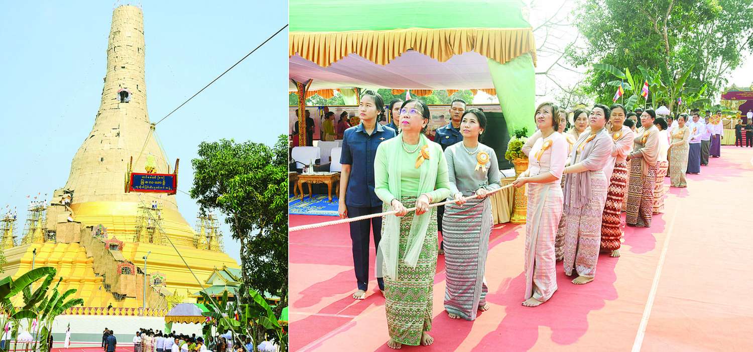 ထို့နောက် မင်္ဂလာအချိန်တွင် နိုင်ငံတော်စီမံအုပ်ချုပ်ရေးကောင်စီဥက္ကဋ္ဌ နိုင်ငံတော်ဝန်ကြီးချုပ်၏ ဇနီးနှင့် မိသားစုဝင်များ၊ အဖွဲ့ဝင်များ၊ အခမ်းအနားတက်ရောက်လာကြသူများနှင့် ဒေသခံတိုင်းရင်းသားပြည်သူလူထုတို့က မင်္ဂလာကြိုးဆွဲ၍ ရတနာစိန်ဖူးတော်၊ ငှက်မြတ်နားတော်တို့ကို မင်္ဂလာရထားပျံဖြင့် စေတီတော်အထွတ်သို့ ပင့်ဆောင်ကြသည်။