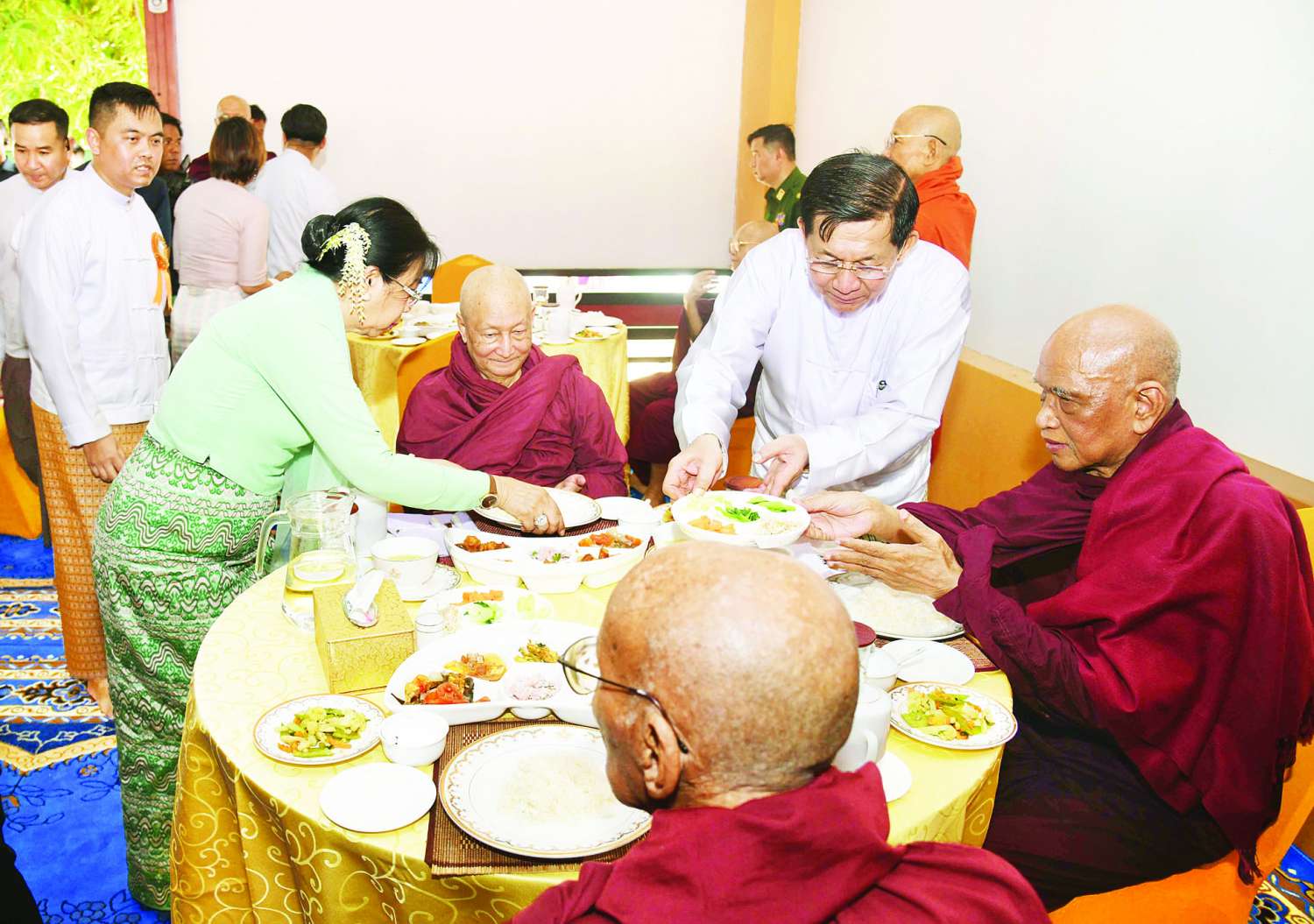 အခမ်းအနားများအပြီးတွင် နိုင်ငံတော်စီမံအုပ်ချုပ်ရေးကောင်စီဥက္ကဋ္ဌ နိုင်ငံတော်ဝန်ကြီးချုပ် နှင့်ဇနီး၊ အခမ်းအနားတက်ရောက်လာကြသူများသည် ဆရာတော်၊ သံဃာတော်များအား နေ့ဆွမ်းဆက်ကပ်လှူဒါန်းကြကာ တက်ရောက်လာကြသည့် ဧည့်သည်တော်များအား စတုဒိသာမဏ္ဍပ်များအတွင်း၌ နေ့လယ်စာဖြင့် တည်ခင်းဧည့်ခံခဲ့ကြသည်။