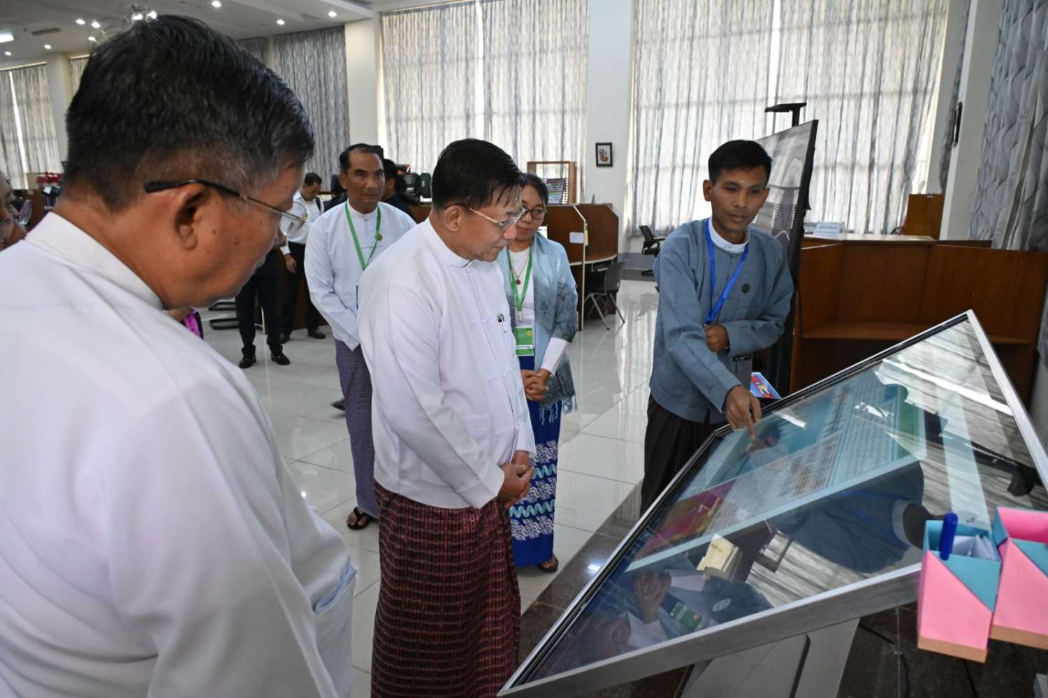 အခမ်းအနားအပြီးတွင် နိုင်ငံတော်စီမံအုပ်ချုပ်ရေးကောင်စီဥက္ကဋ္ဌ နိုင်ငံတော်ဝန်ကြီးချုပ်သည် အခမ်းအနား တက်ရောက်လာကြသူများအား ရင်းရင်းနှီးနှီးနှုတ်ဆက်ပြီး ခင်းကျင်းပြသထားသည့် စာအုပ်စာစောင်များနှင့် အမျိုးသားစာကြည့်တိုက်ရှိ e-Library and Reading Room တို့ကို လှည့်လည်ကြည့်ရှုသည်။