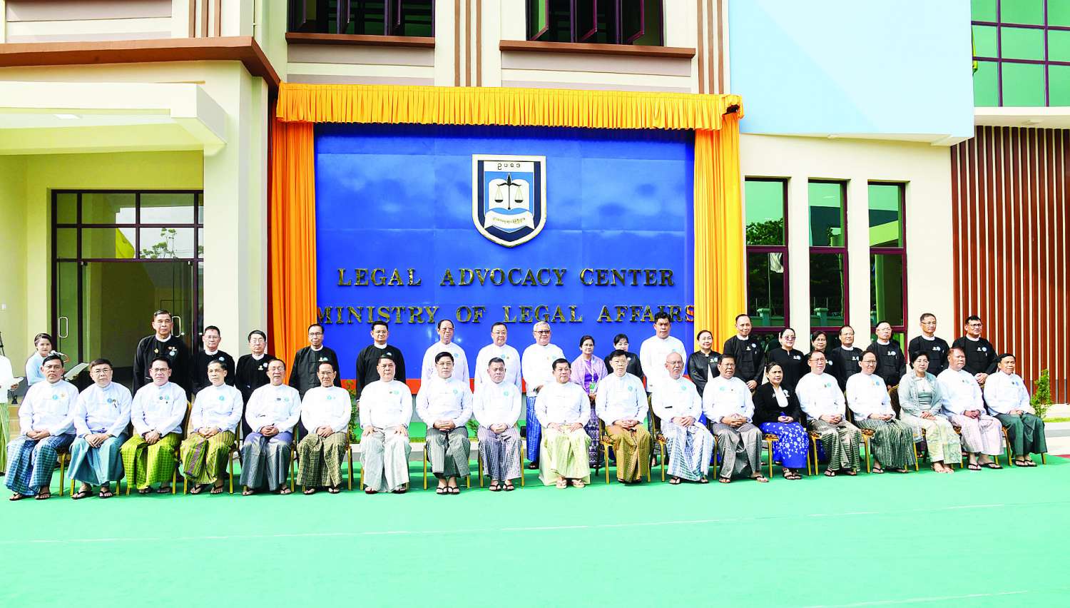 ထို့နောက် နိုင်ငံတော်စီမံအုပ်ချုပ်ရေးကောင်စီဥက္ကဋ္ဌ နိုင်ငံတော်ဝန်ကြီးချုပ်က ဥပဒေအသိပညာ ပြန့်ပွားရေးသင်တန်းကျောင်း LEGAL ADVOCACY CENTER (LAC) ကို စက်ခလုတ်နှိပ်ဖွင့်လှစ်ပေးပြီး အခမ်းအနားတက်ရောက်လာကြသူများနှင့်အတူ စုပေါင်းမှတ်တမ်းတင် ဓာတ်ပုံရိုက်သည်။