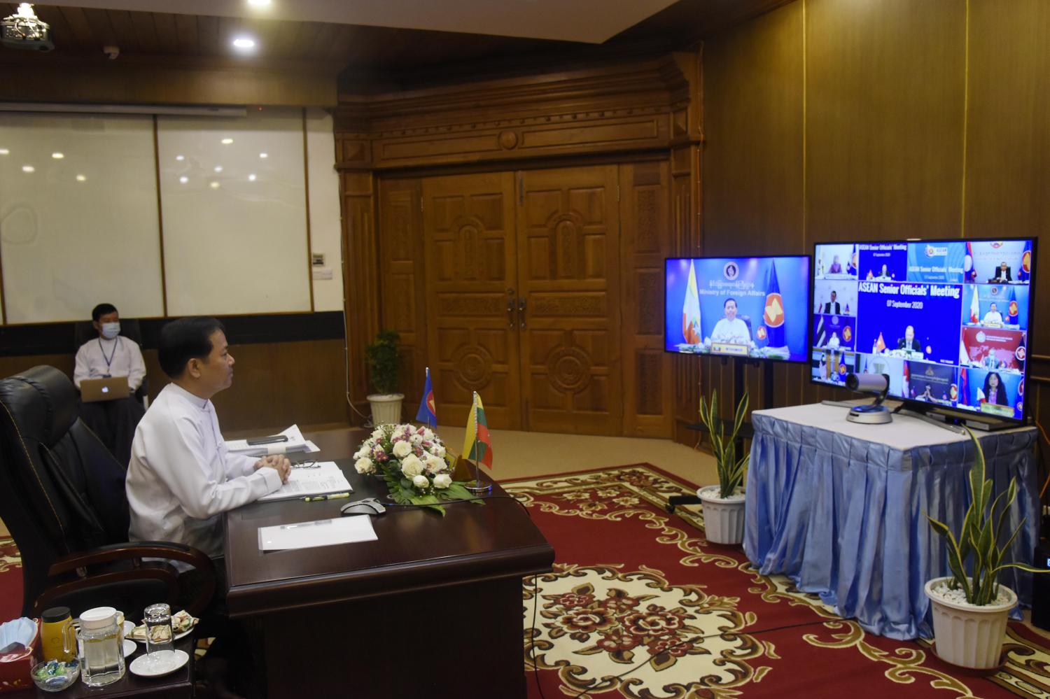 အာဆီယံ အဆင့်မြင့် အရာရှိကြီးများအစည်းအဝေးနှင့် အရှေ့တောင်အာရှ နျူကလီးယား လက်နက်ကင်းမဲ့ဇုန်ဆိုင်ရာ အလုပ်အမှုဆောင်ကော်မတီ အစည်းအဝေးတို့ကို ယနေ့ နံနက် ၈ နာရီတွင် Videoconferencing စနစ်ဖြင့် ကျင်းပရာ နိုင်ငံခြားရေးဝန်ကြီးဌာန၊ အမြဲတမ်း အတွင်းဝန် ဦးစိုးဟန်သည် နေပြည်တော်မှ ပါဝင်တက်ရောက်ဆွေးနွေးသည်။
