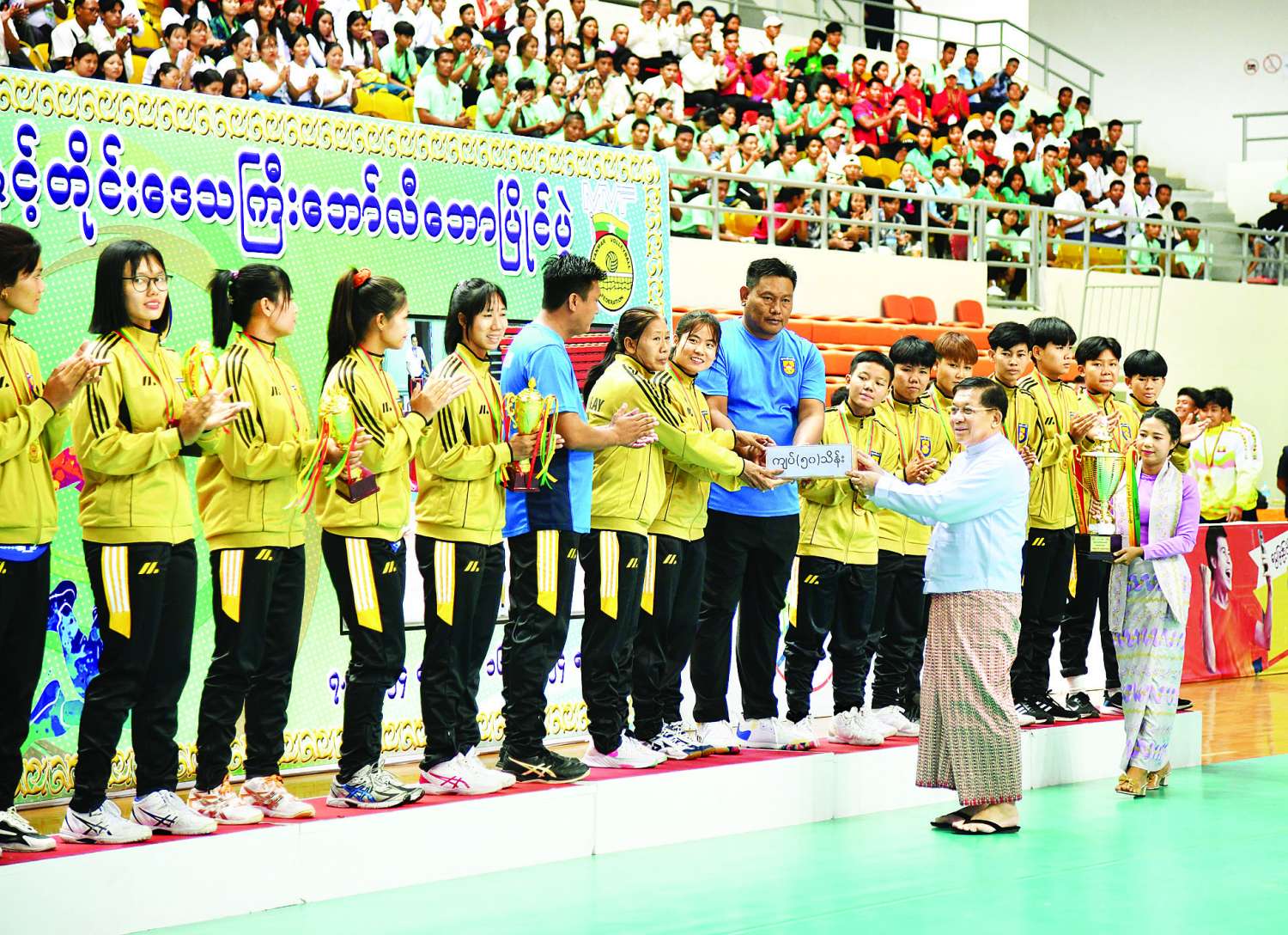 ၂၀၂၄ ခုနှစ်၊ ပြည်နယ်နှင့်တိုင်းဒေသကြီး ဘော်လီဘော(အမျိုးသား/အမျိုးသမီး)ပြိုင်ပွဲ ဗိုလ်လုပွဲနှင့် ဆုချီးမြှင့်ခြင်းအခမ်းအနားကျင်းပ နိုင်ငံတော်စီမံအုပ်ချုပ်ရေးကောင်စီဥက္ကဋ္ဌ နိုင်ငံတော်ဝန်ကြီးချုပ် ဗိုလ်ချုပ်မှူးကြီး မင်းအောင်လှိုင် တက်ရောက်ကြည့်ရှုအားပေးပြီး ဆုများပေးအပ်ချီးမြှင့်