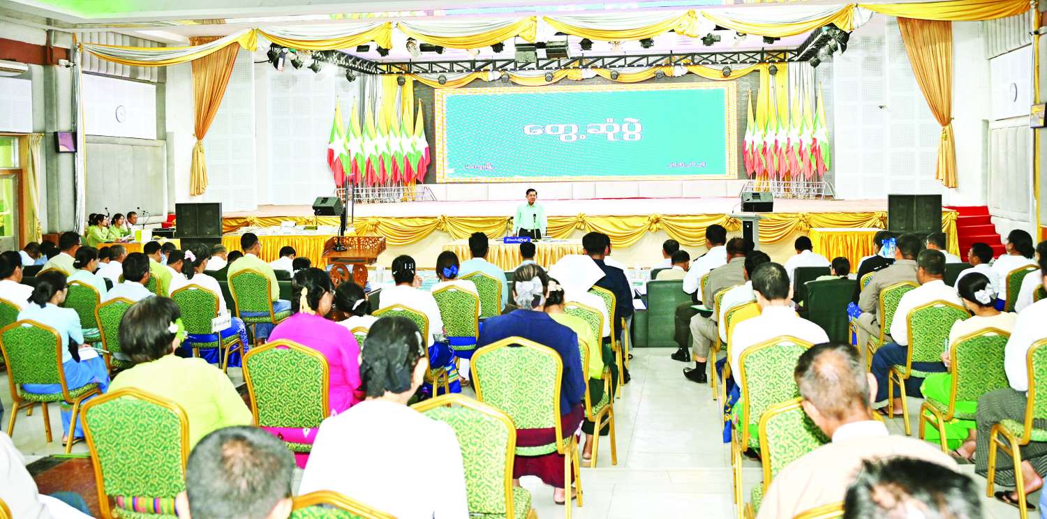ဒေသတည်ငြိမ်အေးချမ်းရေးအတွက် ပြည်သူ့လုံခြုံရေးစနစ်ကိုလည်း စနစ်တကျဖြင့် ဆောင်ရွက်ကြရန်လိုကြောင်း၊ တစ်ဦးနှင့်တစ်ဦး အပြန်အလှန်ထိန်းကြောင်း၍ အသိတရား၊ သတိတရားများဖြင့် ထိန်းထိန်းသိမ်းသိမ်းဆောင်ရွက်မှသာလျှင် ဒေသအလိုက် တည်ငြိမ်အေးချမ်းပြီး ဖွံ့ဖြိုးတိုးတက်မှုကို ပိုမိုဖြစ်ပေါ်စေနိုင်မည်ဖြစ်ကြောင်း၊ နိုင်ငံသားတိုင်းသည် နိုင်ငံတော်ကာကွယ်ရန်တာဝန်ရှိသည်ဖြစ်သဖြင့် ပြည်သူ့စစ်မှုထမ်းဥပဒေကို ယခင်ကတည်းကထုတ်ပြန်ခဲ့ခြင်းဖြစ်ပြီး ယခုအခါ ပြည်သူ့စစ်မှုထမ်းဥပဒေကို စတင်အာဏာတည်စေခဲ့ပြီးဖြစ်ကြောင်း၊ ရည်ရွယ်ချက်မှာ နိုင်ငံတော်၏ အမျိုးသားရေးတာဝန်ဖြစ်သည့် ဒို့တာဝန်အရေး ၃ ပါးကိုကာကွယ်စောင့်ရှောက်ရန်ဖြစ်ပြီး လက်ရှိတွင် စတင်လည်ပတ်နေပြီဖြစ်ကြောင်း၊ သတ်မှတ်အသက်အရွယ်အပိုင်းအခြားအတွင်းမှ သင့်တင့်လျောက်ပတ်သည့်အင်အားကိုသာ သတ်မှတ်ကာလအတွင်း တာဝန်ထမ်းဆောင်ရန်ဖြစ်ပြီး နိုင်ငံတော်နှင့် ပြည်သူ့အတွက် ဝန်ထုပ်ဝန်ပိုးမဖြစ်စေရေး ဆက်လက်ဆောင်ရွက်သွားမည်ဖြစ်ကြောင်း၊ ယင်းဥပဒေနှင့်ပတ်သက်၍ ထုတ်ပြန်ထားသည့်ဥပဒေကို သေချာစွာလေ့လာခြင်းမရှိဘဲ အခြေအမြစ်မရှိသည့် သတင်းမှားများ၊ ထင်မြင်သုံးသပ်ချက်များအပေါ်တွင် အခြေခံ၍ သွေးထိုးလှုံ့ဆော်နေသည်များရှိသည့်အတွက် ဌာနဆိုင်ရာများအနေဖြင့်လည်း ပြည်သူ့စစ်မှုထမ်းဥပဒေနှင့်ပတ်သက်၍ မိမိတို့ကိုယ်တိုင်သိရှိနားလည်ရန်လိုအပ်ပြီး ပြည်သူများ အသိအမြင်မှန်များရရှိ စေရေး ဆောင်ရွက်ပေးရန်လိုကြောင်း။