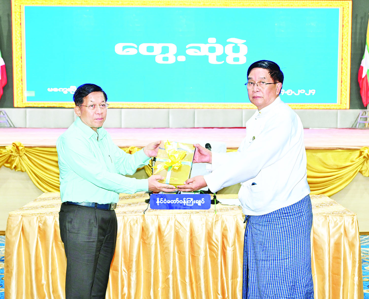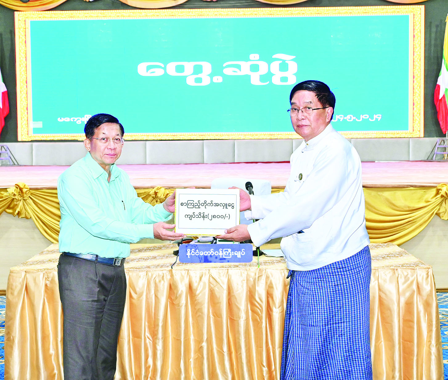 ထို့နောက် နိုင်ငံတော်စီမံအုပ်ချုပ်ရေးကောင်စီဥက္ကဋ္ဌ နိုင်ငံတော်ဝန်ကြီးချုပ်က မကွေးတိုင်းဒေသကြီးအတွင်းရှိ စာကြည့်တိုက်များဖွံ့ဖြိုးတိုးတက်ရေးအတွက် အလှူငွေကျပ်သိန်း ၂၈၀၀ နှင့် စာအုပ်၊ စာစောင် ၅၅၀၀ အုပ်တို့ကို လွှဲအပ်လှူဒါန်းရာ တိုင်းဒေသကြီးဝန်ကြီးချုပ်က လက်ခံရယူသည်။