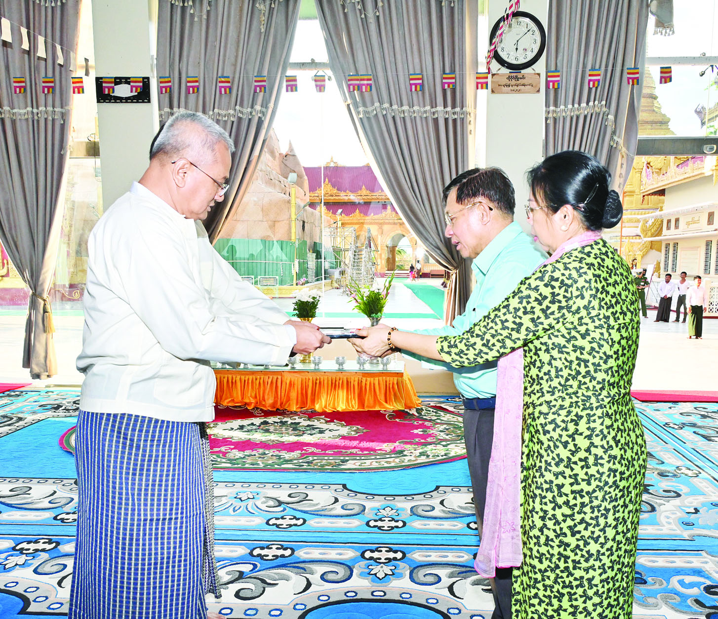 ဆက်လက်ပြီး နိုင်ငံတော်စီမံအုပ်ချုပ်ရေးကောင်စီဥက္ကဋ္ဌ နိုင်ငံတော်ဝန်ကြီးချုပ်နှင့် ဇနီး၊ အဖွဲ့ဝင်များသည် မကွေးမြို့ ကျက်သရေဆောင် မြသလွန်စေတီတော်မြတ်ကြီးသို့ ရောက်ရှိကြရာ ဂေါပကအဖွဲ့မှ တာဝန်ရှိသူများက ကြိုဆိုနှုတ်ဆက်ကြသည်။ ယင်းနောက် စေတီတော်မြတ်ကြီးအား ဖူးမြော်ကြည်ညိုကာ ပန်း၊ ရေချမ်း ကပ်လှူပူဇော်ကြသည်။ ထို့နောက် နိုင်ငံတော်စီမံအုပ်ချုပ်ရေးကောင်စီဥက္ကဋ္ဌ နိုင်ငံတော်ဝန်ကြီးချုပ်နှင့် ဇနီးတို့က ဘက်စုံအလှူတော်ငွေများကို ပေးအပ်လှူဒါန်းရာ ဂေါပကအဖွဲ့မှ တာဝန်ရှိသူများက လက်ခံရယူပြီး ဓမ္မလက်ဆောင် ပြန်လည်ပေးအပ်သည်။