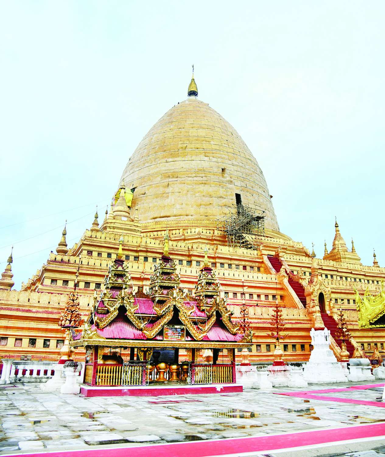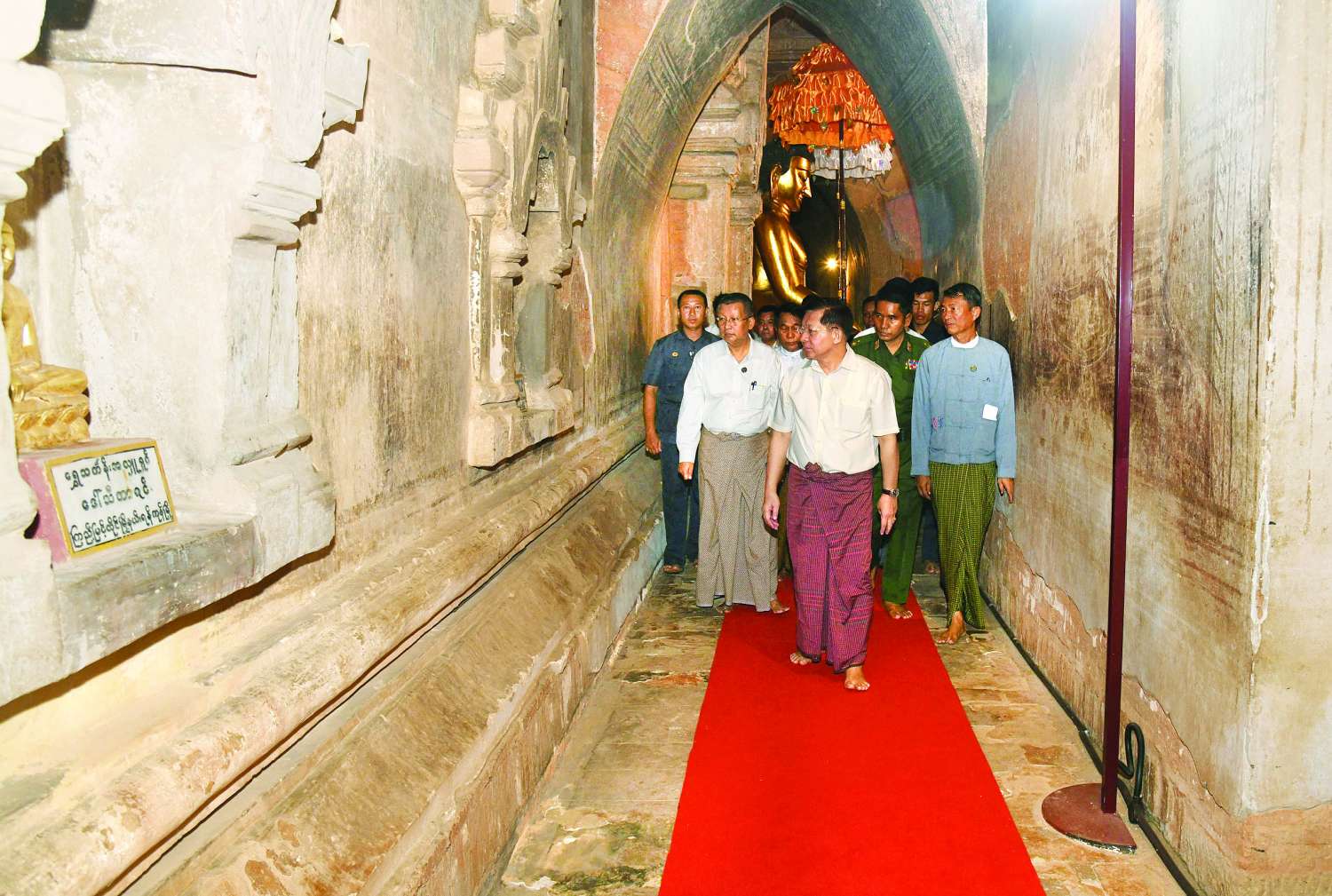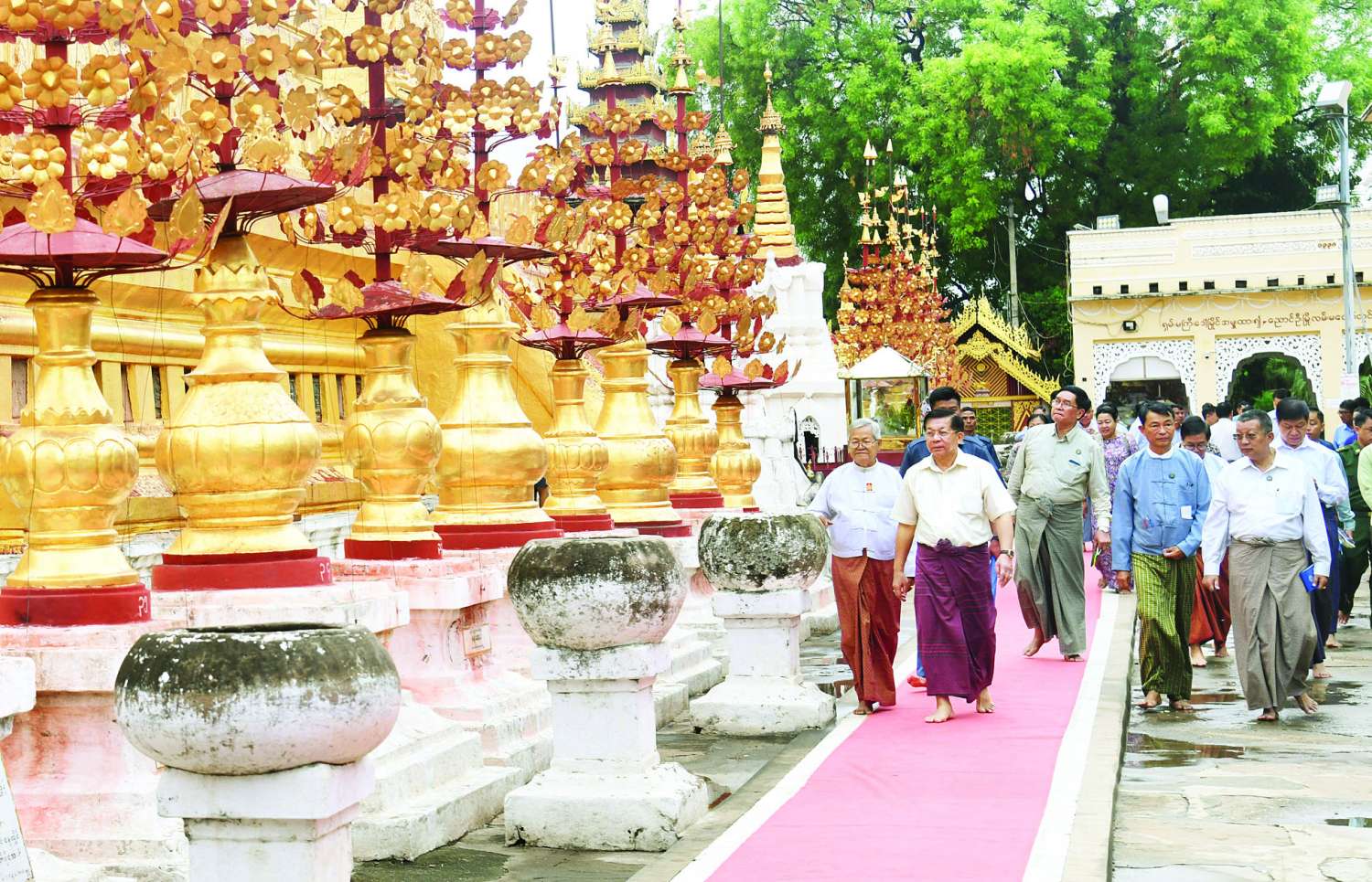 ထို့နောက် နိုင်ငံတော်စီမံအုပ်ချုပ်ရေးကောင်စီဥက္ကဋ္ဌ နိုင်ငံတော်ဝန်ကြီးချုပ်နှင့် ဇနီး၊ အဖွဲ့ဝင်များသည် စေတီတော်မြတ်ကြီးအား လက်ယာရစ်လှည့်လည်ဖူးမြော်ကြည်ညို၍ စေတီတော်မြတ်ကြီးပရိဝုဏ်အတွင်း ရှေးဟောင်းအမွေအနှစ်လက်ရာများကို ထိန်းသိမ်းထားရှိမှုအခြေအနေများကို ကြည့်ရှုစစ်ဆေးကာ တာဝန်ရှိသူများ၏ တင်ပြချက်များအပေါ် စေတီတော်ကြီးရင်ပြင်တော်တွင်ခင်းကျင်းထားသည့် ကျောက်ပြားများ၏ အချို့နေရာများသည် မိုးရွာသွန်းပြီးနောက် ရေတင်ကျန်မှုများဖြစ်ပေါ်နိုင်သဖြင့် လိုအပ်သည့် ပြုပြင်ထိန်းသိမ်းမှုများ ဆောင်ရွက်ရန်လိုကြောင်း၊ စေတီတော်မြတ်ကြီးရှိ ငါးရာ့ငါးဆယ်ဇာတ်တော်စဉ့်ကွင်းများ၊ ကျောက်သပိတ်တော်ကြီးများ၊ သုဓမ္မာဇရပ်များရှိ မြန်မာ့ဗိသုကာပညာရပ်အမွေအနှစ်များကို ပညာရှင်များနှင့် တိုင်ပင်ဆွေးနွေး၍ မူလလက်ရာမပြတ်ထိန်းသိမ်းပြုပြင်မှုများ ဆောင်ရွက်ထားရှိရန်လိုကြောင်း၊ တန်ဖိုးမဖြတ်နိုင်သည့် ရှေးဟောင်းလက်ရာများကို ထိန်းသိမ်းရာတွင် စနစ်တကျနှင့်ရေရှည်တည်တံ့အောင် ထိန်းသိမ်းရန်လိုပြီး သဘာဝဘေးအန္တရာယ်ကြောင့် ထိခိုက်ပျက်စီးမှုများမရှိစေရေး လိုအပ်သည့် ပြုပြင်ဆောင်ရွက်မှုများကို တာဝန်ရှိသူများက အမြဲမပြတ်စစ်ဆေးဆောင်ရွက်နေရမည်ဖြစ်ကြောင်း၊ စေတီတော်မြတ်ကြီး၏ အရပ်လေးမျက်နှာရှိ ကြေးဂူတိုက် ၄ ခုအတွင်း တည်ထားပူဇော်ထားရှိသည့် ဉာဏ်တော် ၁၂ ပေရှိ ရပ်တော်မူကြေးဆင်းတုတော်များသည် ပုဂံခေတ်ရပ်တော်မူဗုဒ္ဓရုပ်ပွားတော်ဟန် ပီပြင်တင့်တယ်တော်မူပြီး သာမာန်ကြေးသွန်းထားခြင်းမဟုတ်ဘဲ အတွင်းမှဖောင်းထုတ်ပုံဖော်စေသည့် “ကြေးခတ်” လက်ရာဖြစ်သဖြင့် ရှေးဟောင်းအနုပညာလက်ရာ ခေတ်မီထွန်းကားခဲ့ပုံကို သိမြင်စေနိုင်ကြောင်း၊ ထို့ကြောင့် သမိုင်းတန်ဖိုးလွန်စွာကြီးမားလှသည့် ရှေးဟောင်းအနုပညာလက်ရာများအား ဘုရားဖူးလာ ပြည်တွင်း၊ ပြည်ပမှ ဧည့်သည်များ အလွယ်တကူဖတ်မှတ်သိရှိ၍ ကြည်ညိုသပ္ပါယ်တန်ဖိုးထားနိုင်ရေး ရေးသားဖော်ပြထားရန်လိုကြောင်းနှင့် အခြားလိုအပ်သည်များကို မှာကြားသည်။