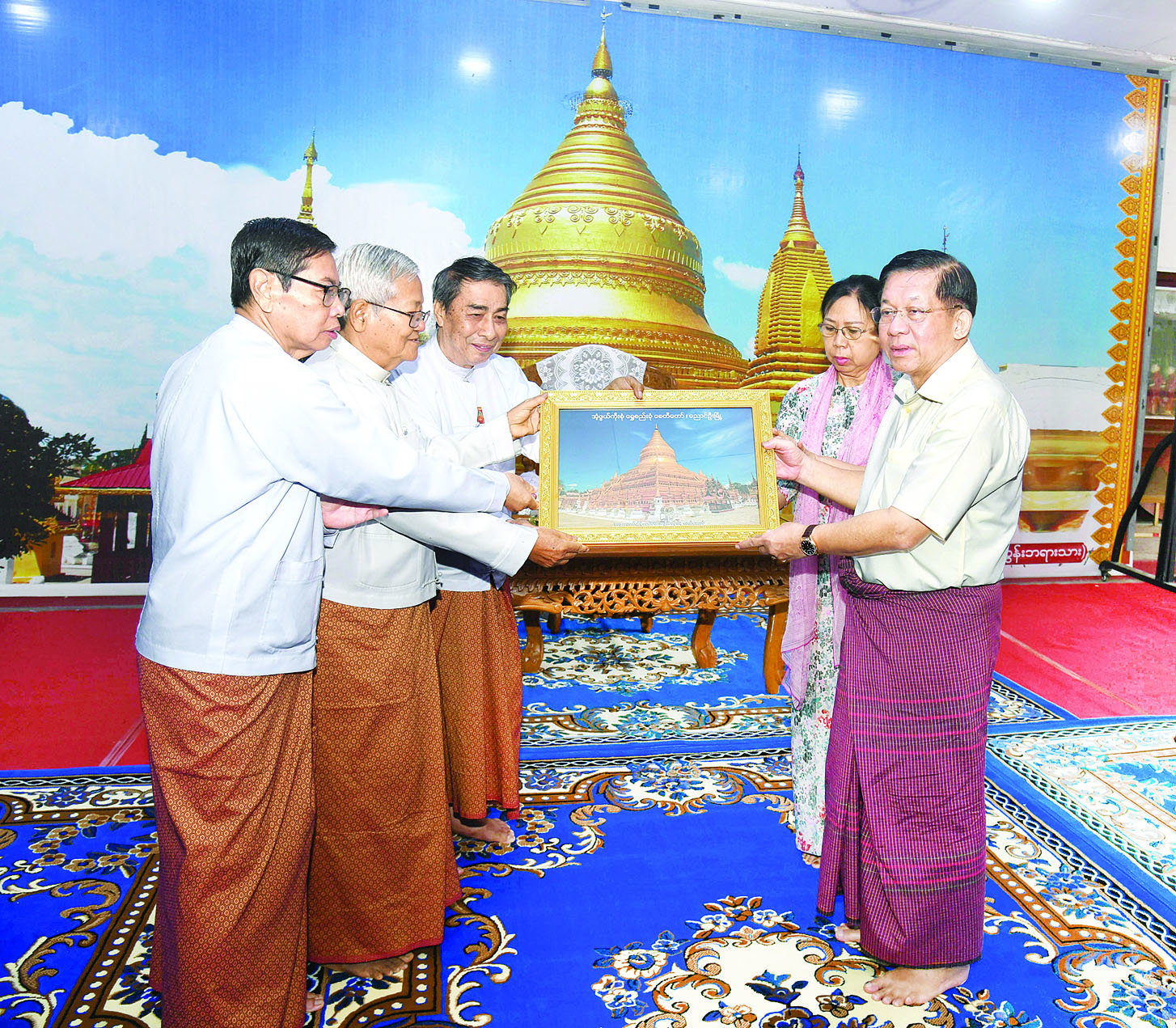ယင်းနောက် နိုင်ငံတော်စီမံအုပ်ချုပ်ရေးကောင်စီဥက္ကဋ္ဌ နိုင်ငံတော်ဝန်ကြီးချုပ်နှင့် ဇနီးတို့သည် ထီးလိုမင်းလိုဘုရားကြီးအတွင်း တည်ထားကိုးကွယ်သည့် ရုပ်ပွားတော်မြတ်များအား ရွှေသင်္ကန်းတော်ကပ်လှူရန် ရွှေစင်ရွှေသားများနှင့် ဘက်စုံပြုပြင်ထိန်းသိမ်းရန်အတွက် အလှူတော်ငွေများကို ပေးအပ်လှူဒါန်းရာဂေါပကအဖွဲ့မှ တာဝန်ရှိသူများက လက်ခံရယူကြပြီး ဂုဏ်ပြုမှတ်တမ်းလွှာနှင့် ဓမ္မလက်ဆောင်ပြန်လည်ပေးအပ်သည်။