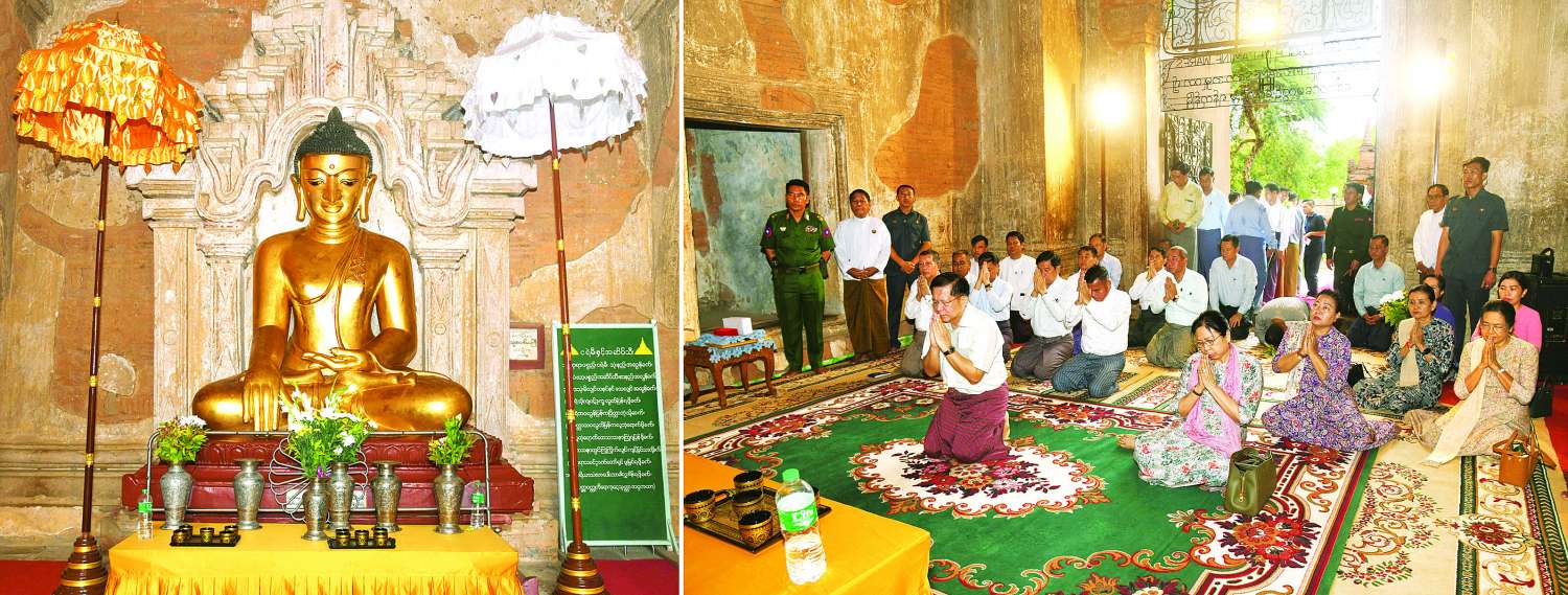 ထို့နောက် နိုင်ငံတော်စီမံအုပ်ချုပ်ရေးကောင်စီဥက္ကဋ္ဌ နိုင်ငံတော်ဝန်ကြီးချုပ်နှင့် အဖွဲ့ဝင်များသည် ထီးလိုမင်းလိုဘုရားကြီးသို့ ရောက်ရှိကြပြီး ပန်း၊ ရေချမ်းကပ်လှူပူဇော်၍ ဖူးမြော်ကြည်ညိုကြသည်။ ယင်းနောက် ဘုရားကြီးအတွင်း၊ အပြင်တို့၌ ၁ ဘေးအန္တရာယ်ကြောင့် ထိခိုက်ပျက်စီးခဲ့မှုအခြေအနေများကို ထိန်းသိမ်းထားရှိမှုများနှင့် ဘုရားကြီးအတွင်းပရိဝုဏ်အတွင်း သဲကျောက်ပြားလျှောက်လမ်းဆောင်ရွက်ထားရှိမှု အခြေအနေများအား လိုက်လံကြည့်ရှုစစ်ဆေးပြီး တာဝန်ရှိသူများ၏ တင်ပြချက်များအပေါ် ပုဂံရှေးဟောင်းယဉ်ကျေးမှုနယ်မြေရှိ ဘုရား၊ စေတီ၊ ပုထိုးများသည် ရှေးဟောင်းသမိုင်းဝင်လက်ရာများဖြစ်ပြီး တန်ဖိုးမဖြတ်နိုင်သည့် အမွေအနှစ်များဖြစ်သည့်အတွက် ထိန်းသိမ်းဆောင်ရွက်မှုများကို အလေးထားဆောင်ရွက်ရန်လိုကြောင်းနှင့် အခြားလိုအပ်သည်များကို မှာကြားသည်။