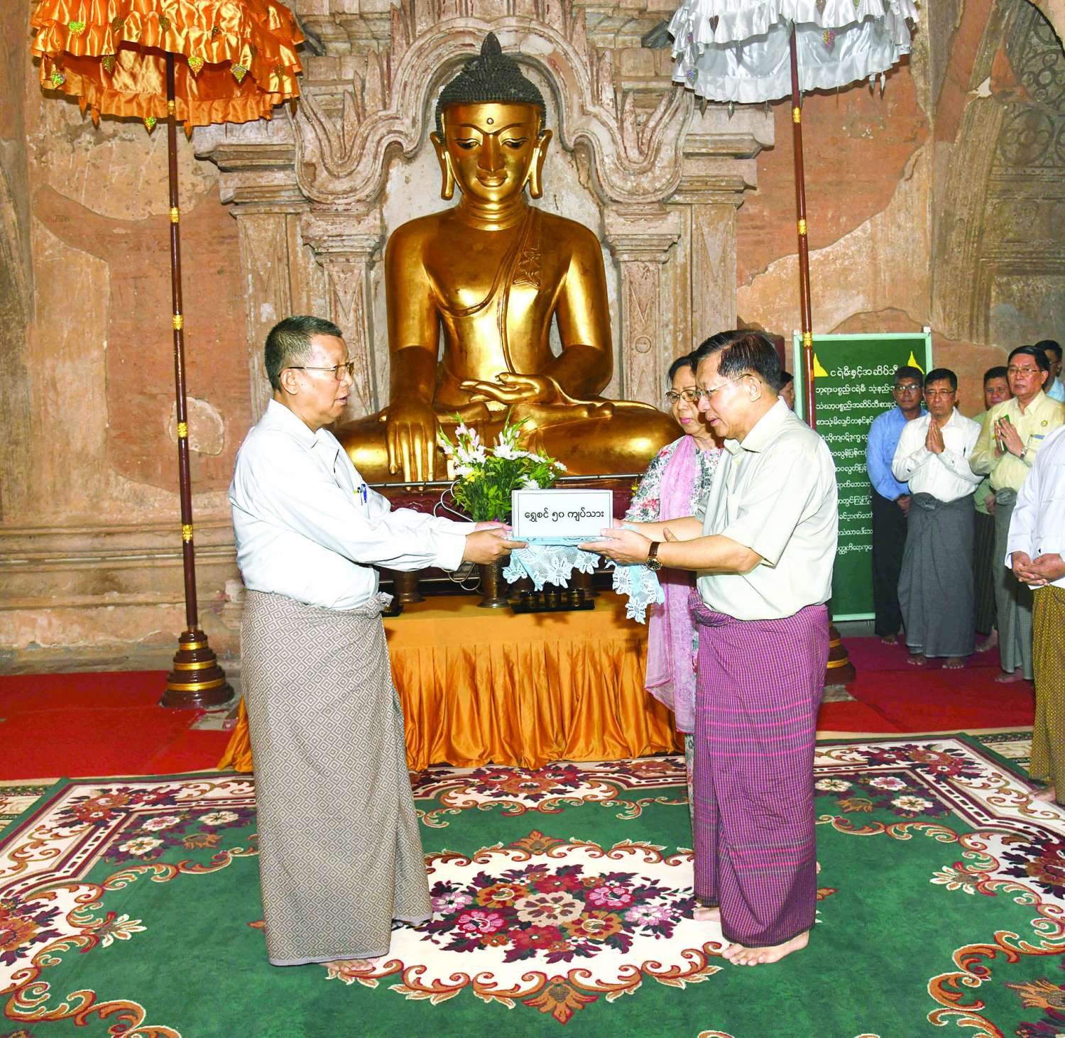 ထို့နောက် နိုင်ငံတော်စီမံအုပ်ချုပ်ရေးကောင်စီဥက္ကဋ္ဌ နိုင်ငံတော်ဝန်ကြီးချုပ်က ပုဂံရှေးဟောင်းယဉ်ကျေးမှုနယ်မြေအတွင်း ရှေးဟောင်းအမွေအနှစ်ဖော်ထုတ်ရေးနှင့် ထိန်းသိမ်းရေးလုပ်ငန်းများဆောင်ရွက်လျက်ရှိသည့် ဝန်ထမ်းများအတွက် ချီးမြှင့်ငွေများကို ပေးအပ်ရာ ရှေးဟောင်းသုတေသနနှင့် အမျိုးသားပြတိုက်ဦးစီးဌာန ညွန်ကြားရေးမှူးချုပ်က လက်ခံရယူသည်။