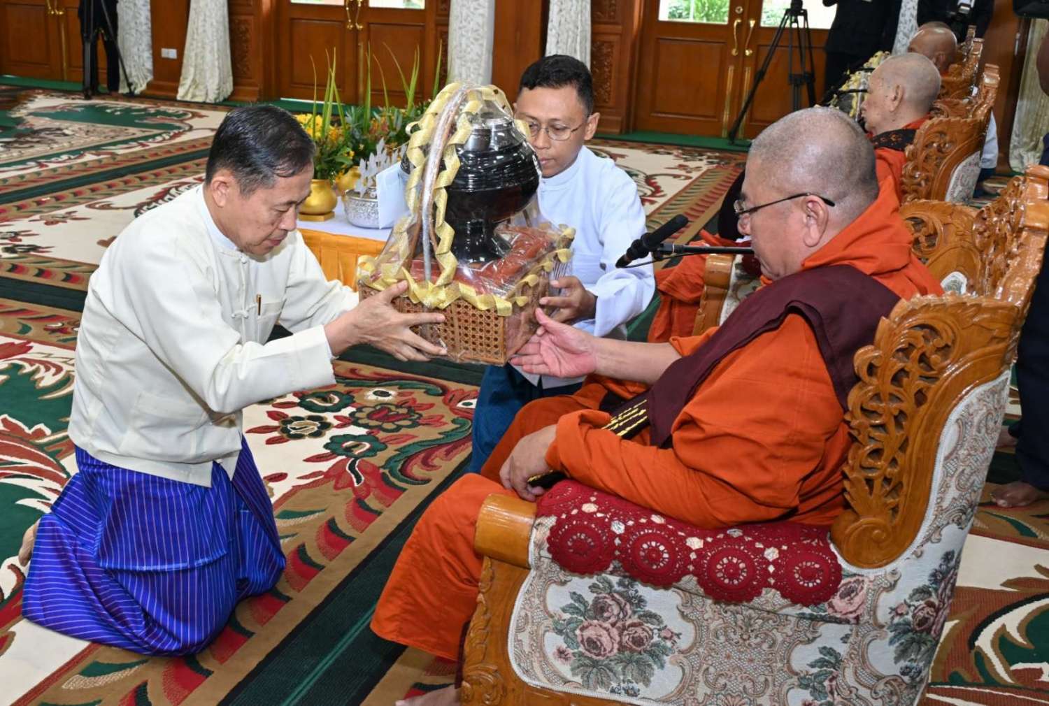 ယင်းနောက် နိုင်ငံတော်စီမံအုပ်ချုပ်ရေးကောင်စီဒုတိယဥက္ကဋ္ဌ ဒုတိယတပ်မတော်ကာကွယ်ရေးဦးစီးချုပ် ကာကွယ်ရေးဦးစီးချုပ် (ကြည်း) က နိုင်ငံတော်သံဃမဟာနာယကအဖွဲ့အကျိုးတော်ဆောင် မစိုးရိမ်တိုက်သစ်ဆရာတော်ကြီးထံ ဝါဆိုသင်္ကန်းနှင့် လှူဖွယ်ပစ္စည်းများကို ဆက်ကပ်လှူဒါန်းသည်။