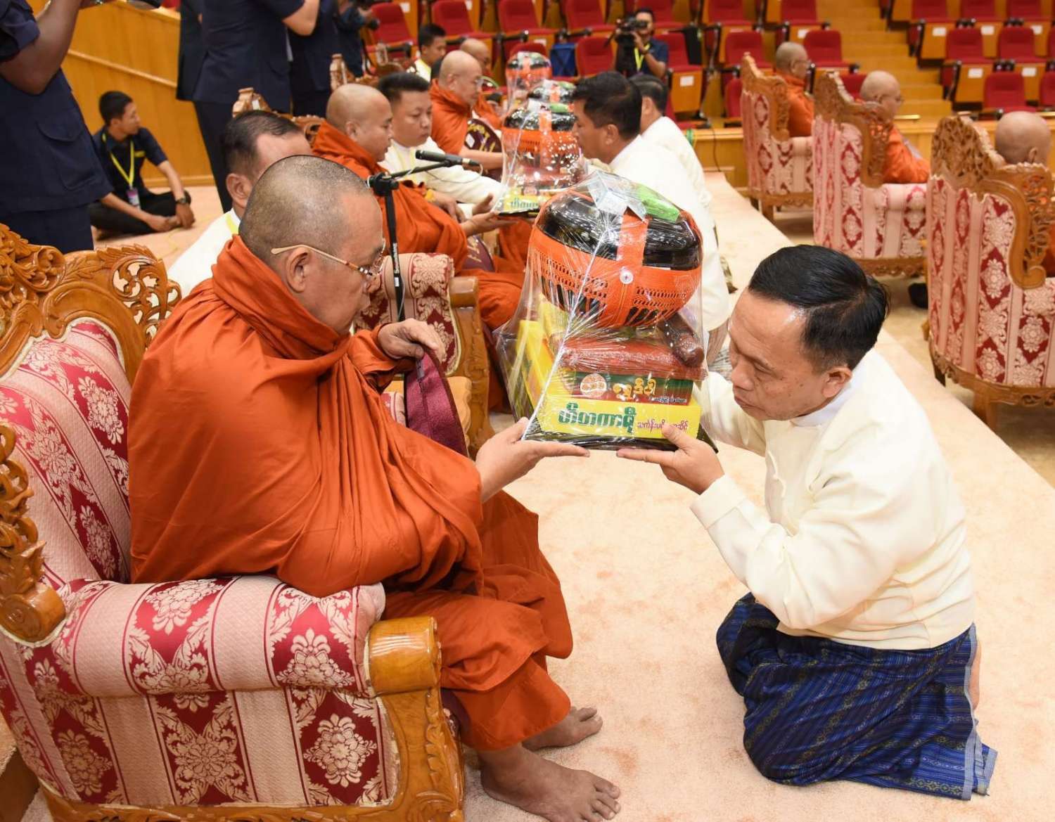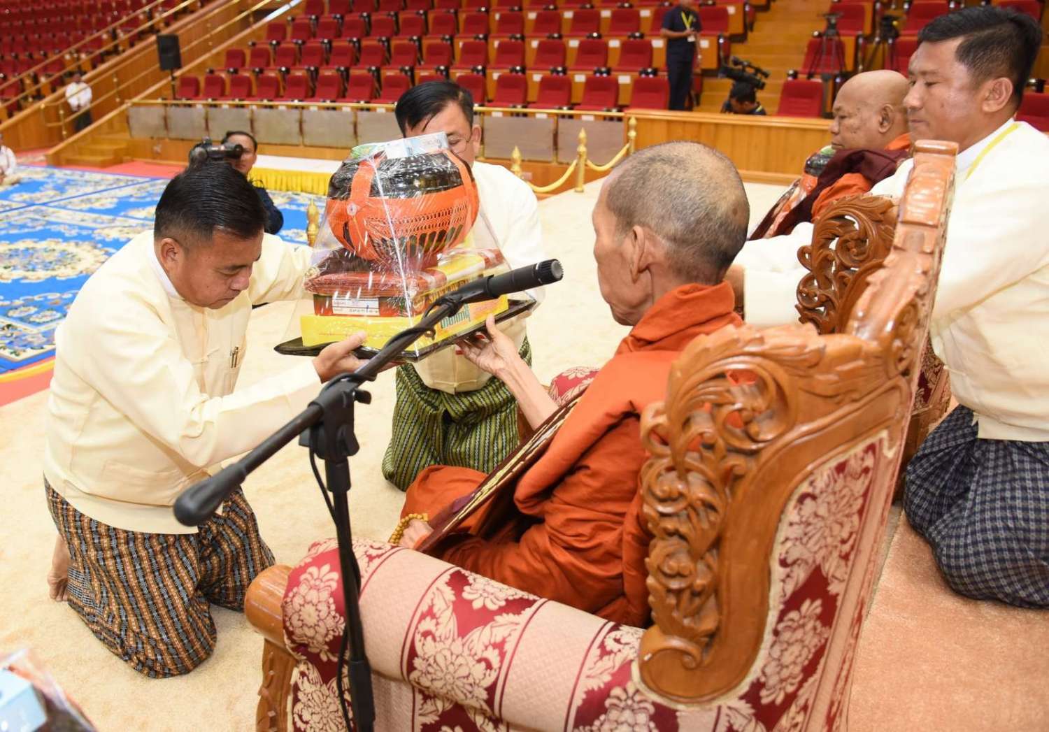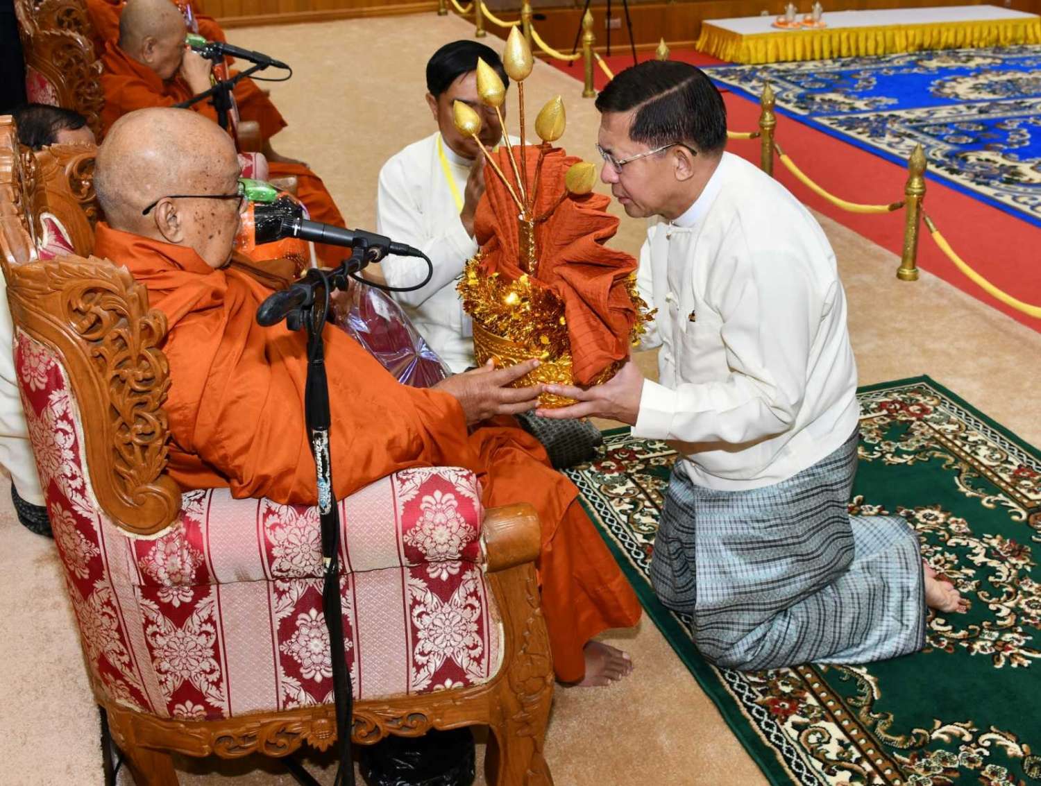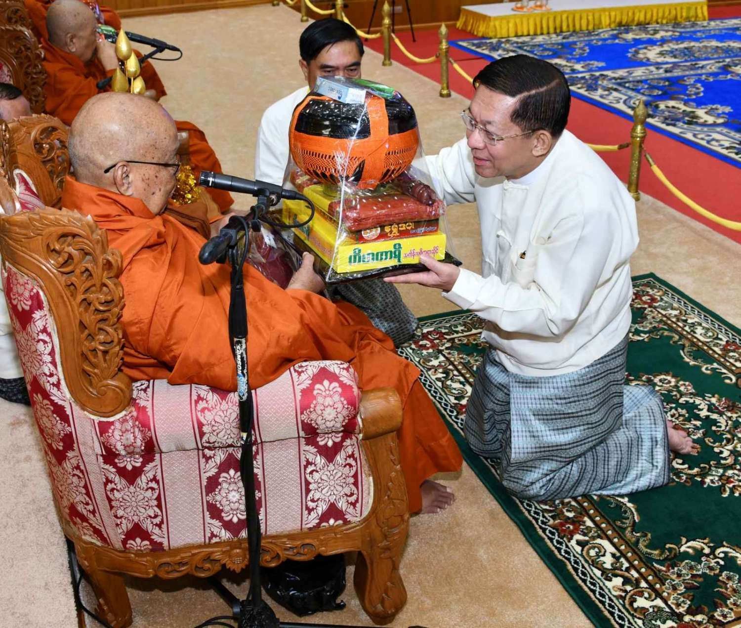 အဆိုပါအခမ်းအနားသို့ နေပြည်တော်၊ လယ်ဝေးမြို့၊ ပေါက်မြိုင်ကျောင်းတိုက် ပဓာနနာယက အဘိဓဇမဟာရဋ္ဌဂုရု ဘဒ္ဒန္တ ဇနိန္ဒ၊ နိုင်ငံတော်သြဝါဒါစရိယ၊ တပ်ကုန်းမြို့၊ မဟာသီဟနာဒကျောင်းတိုက်ဆရာတော် အဘိဓဇ မဟာရဋ္ဌဂုရု ဘဒ္ဒန္တ အာစိဏ္ဏတို့အမှူးပြုသော ဆရာတော်ကြီးများ ကြွရောက်ချီးမြှင့်တော်မူကြပြီး နိုင်ငံတော်စီမံအုပ်ချုပ်ရေးကောင်စီဥက္ကဋ္ဌ နိုင်ငံတော်ဝန်ကြီးချုပ်၊ နိုင်ငံတော်စီမံအုပ်ချုပ်ရေးကောင်စီဒုတိယဥက္ကဋ္ဌ ဒုတိယဝန်ကြီးချုပ် ဒုတိယဗိုလ်ချုပ်မှူးကြီး စိုးဝင်း၊ ကောင်စီအတွင်းရေးမှူး၊ တွဲဖက်အတွင်းရေးမှူး၊ ကောင်စီဝင်များ၊ ပြည်ထောင်စုအဆင့်ပုဂ္ဂိုလ်များ၊ ပြည်ထောင်စုဝန်ကြီးများ၊ နေပြည်တော်ကောင်စီဥက္ကဋ္ဌ၊ ကာကွယ်ရေးဦးစီးချုပ်ရုံးမှ အဆင့်မြင့်တပ်မတော်အရာရှိကြီးများ၊ နေပြည်တော်တိုင်းစစ်ဌာနချုပ်တိုင်းမှူးနှင့် တာဝန်ရှိသူများ တက်ရောက်ကြသည်။