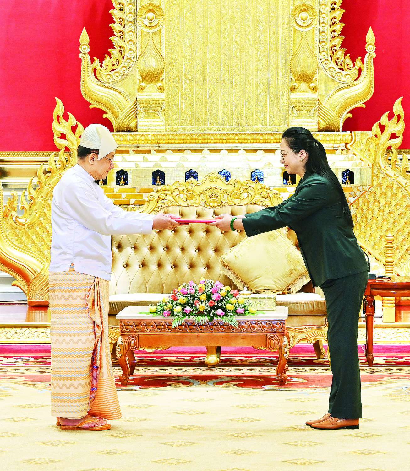 နိုင်ငံတော်စီမံအုပ်ချုပ်ရေးကောင်စီဥက္ကဋ္ဌ နိုင်ငံတော်ဝန်ကြီးချုပ် ဗိုလ်ချုပ်မှူးကြီးမင်းအောင်လှိုင်ထံ မြန်မာနိုင်ငံဆိုင်ရာ တရုတ်ပြည်သူ့သမ္မတနိုင်ငံ သံအမတ်ကြီးအဖြစ်ခန့်အပ်ရန်သဘောတူညီပြီးဖြစ်သော သံအမတ်ကြီး H.E. Ms. Ma Jia သည် ယနေ့နံနက် ၁၀ နာရီတွင် နေပြည်တော်ရှိ နိုင်ငံတော်စီမံအုပ်ချုပ်ရေးကောင်စီဥက္ကဋ္ဌရုံး၊ သံတမန်ဆောင်ဧည့်ခန်းမ၌ ၎င်း၏သံအမတ်ခန့်အပ်လွှာကို ပေးအပ်သည်။