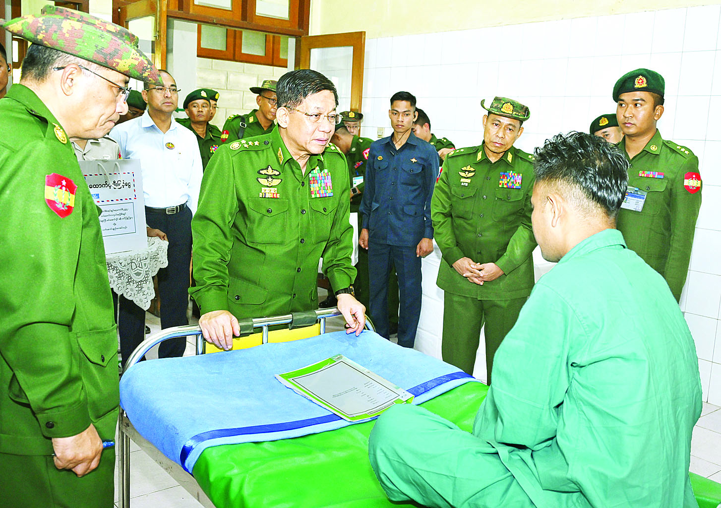 ထို့နောက် နိုင်ငံတော်စီမံအုပ်ချုပ်ရေးကောင်စီဥက္ကဋ္ဌ တပ်မတော်ကာကွယ်ရေးဦးစီးချုပ်နှင့် အဖွဲ့ဝင်များသည် ကျန်းမာရေးဝန်ကြီးဌာန ပြည်ထောင်စုဝန်ကြီး ဒေါက်တာသက်ခိုင်ဝင်းနှင့် ရှမ်းပြည်နယ်ဝန်ကြီးချုပ် ဦးအောင်အောင်တို့ လိုက်ပါ၍ အောင်ပန်းမြို့ရှိ နယ်မြေခံတပ်မတော်ဆေးရုံသို့ သွားရောက်၍ ဆေးရုံတက်ရောက်ကုသမှုခံယူလျက်ရှိသည့် နိုင်ငံတော်ကာကွယ်ရေးနှင့် လုံခြုံရေးတာဝန်များ ထမ်းဆောင်စဉ် ထိခိုက်ဒဏ်ရာရရှိခဲ့သော အရာရှိ၊ စစ်သည်များအား ထိခိုက်ဒဏ်ရာရရှိခဲ့မှုအခြေအနေများ၊ ရောဂါကုသပျောက်ကင်းမှုအခြေအနေများကို တစ်ဦးချင်းလိုက်လံတွေ့ဆုံ၍ ရင်းနှီးနွေးထွေးစွာ မေးမြန်းအားပေးစကားပြောကြားပြီး အရာရှိ၊ စစ်သည်များ၏ တင်ပြချက်များအပေါ် လိုအပ်သည်များ ဖြည့်ဆည်းဆောင်ရွက်ပေးသည်။