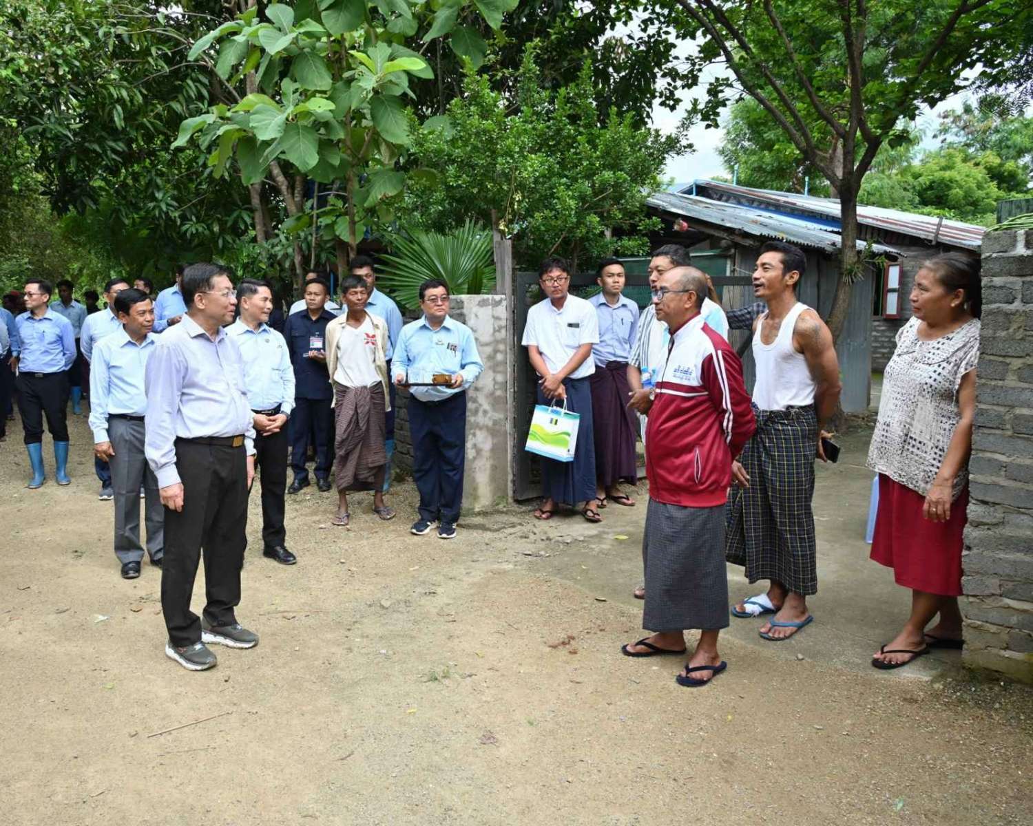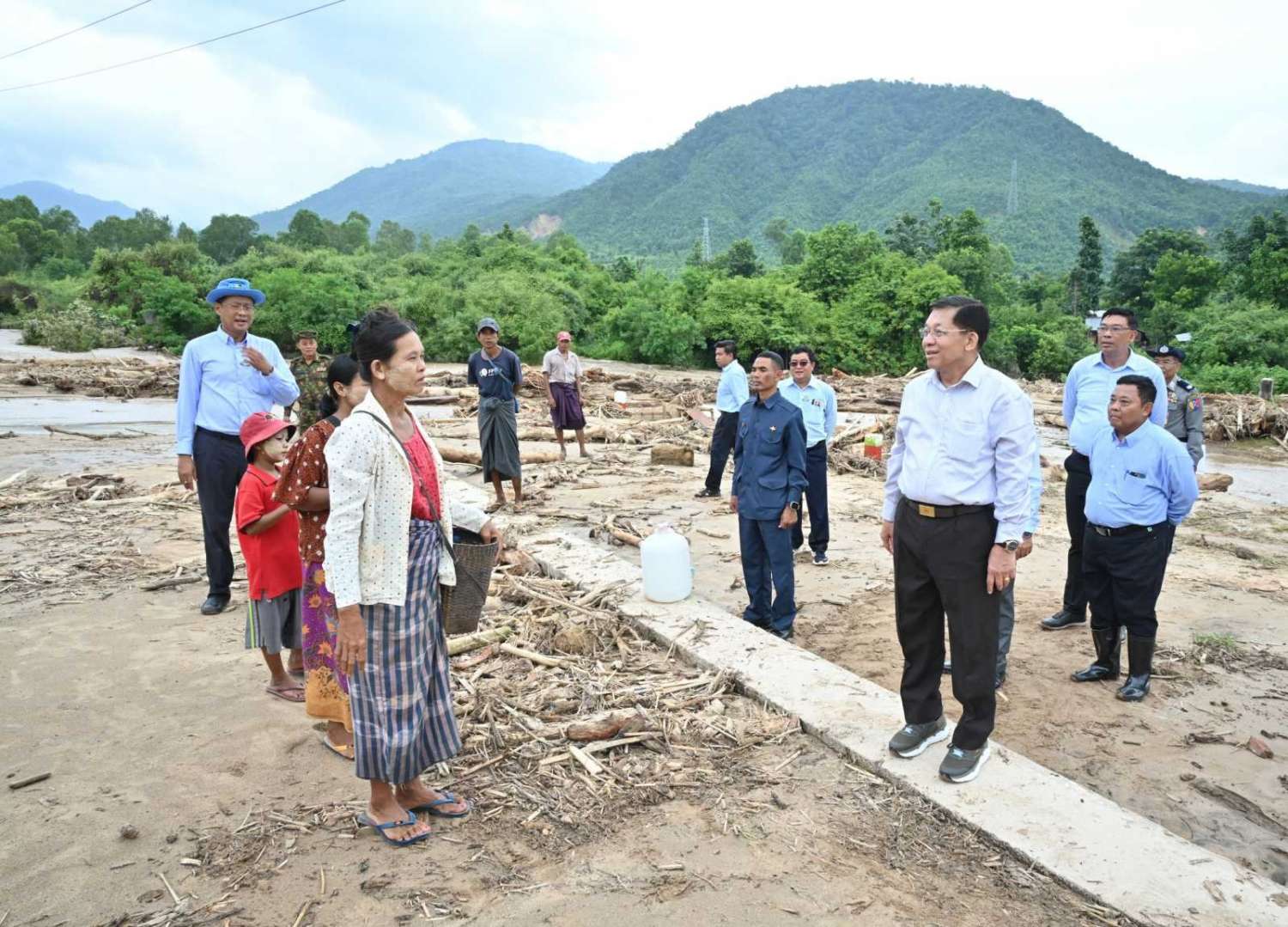 ထို့နောက် နိုင်ငံတော်စီမံအုပ်ချုပ်ရေးကောင်စီဥက္ကဋ္ဌ နိုင်ငံတော်ဝန်ကြီးချုပ်သည် ၃ မိုင်ကျေးရွာရှိ ဒေသခံပြည်သူများအား ရင်းရင်းနှီးနှီးနှုတ်ဆက်ကာ ရေကြီးရေလျှံမှုဖြစ်ပေါ်ခဲ့မှုအခြေအနေများကို မေးမြန်းအားပေးစကားပြောကြားသည်။