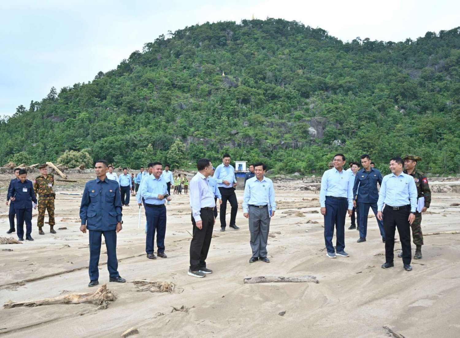 ဦးစွာ နိုင်ငံတော်စီမံအုပ်ချုပ်ရေးကောင်စီဥက္ကဋ္ဌ နိုင်ငံတော်ဝန်ကြီးချုပ်နှင့် အဖွဲ့ဝင်များသည် ဇေယျာသီရိမြို့နယ်မှ ရန်ကုန် - မန္တလေးလမ်းဟောင်းအတိုင်း မော်တော်ယာဉ်များဖြင့် ထွက်ခွာခဲ့ပြီး ဆင်သေချောင်းအတိုင်း ရေတိုက်စားမှုကြောင့် ကားလမ်းဘေး ရေတိုက်စားပျက်စီးနေမှုများ၊ ကုန်တင်ကားကြီးများနှင့် ခရီးသည်တင်ယာဉ်များ စောင့်ဆိုင်းနေရမှုအခြေအနေများကို ကြည့်ရှုစစ်ဆေးသည်။ ထို့နောက် နိုင်ငံတော်စီမံအုပ်ချုပ်ရေးကောင်စီဥက္ကဋ္ဌ နိုင်ငံတော်ဝန်ကြီးချုပ်နှင့် အဖွဲ့ဝင်များသည် နဝင်းချောင်းတံတား (အဆုံ) နေရာသို့ ရောက်ရှိကြပြီး ရေတိုက်စားမှုကြောင့် ပြိုကျပျက်စီးခဲ့မှုအား ယာယီဘေလီတံတား တည်ဆောက်ပြုပြင်နေမှုအခြေအနေများအား ကြည့်ရှုစစ်ဆေးရာ ဆောက်လုပ်ရေးဝန်ကြီးဌာန ပြည်ထောင်စုဝန်ကြီးနှင့် တာဝန်ရှိသူများက အများပြည်သူများ သွားလာမှုအဆင်ပြေစေရေးအတွက် အမြန်ဆုံးပြီးစီးနိုင်ရေး နေ့ညမပြတ် လုပ်ငန်းဆောင်ရွက်လျက်ရှိမှုအခြေအနေများကို ရှင်းလင်းတင်ပြသည်။ ရှင်းလင်းတင်ပြမှုများအပေါ် နိုင်ငံတော်စီမံအုပ်ချုပ်ရေးကောင်စီဥက္ကဋ္ဌ နိုင်ငံတော်ဝန်ကြီးချုပ်က ရေကြီးရေလျှံမှုကြောင့် ပျက်စီးမှုများ ဖြစ်ပေါ်ခဲ့ရသည့် လမ်းတံတား နေရာများအား အများပြည်သူသွားလာရေးအဆင်ပြေစေရန်နှင့် လမ်းပန်းဆက်သွယ်မှု မပြတ်တောက်စေရေး ပြန်လည်ပြုပြင်ခြင်းများကို အမြန်ဆုံးဆောင်ရွက်ပေးသွားရန်လိုကြောင်း၊ ယခုကဲ့သို့ မိုးအဆက်မပြတ်ရွာသွန်းပြီး ရေကြီးရေလျှံမှုဖြစ်ပေါ်ခဲ့ချိန်တွင် တံတားများ ထိခိုက်ပျက်စီးခဲ့မှုအပေါ် သင်ခန်းစာယူ၍ တံတားများ တည်ဆောက်ရာတွင် အရှိန်အဟုန်ဖြင့် ရေစီးဆင်းမှုဒဏ်ကို ခံနိုင်ရေးအတွက် စနစ်တကျထည့်သွင်းတွက်ချက်၍ ပြန်လည်ပြင်ဆင်ဆောင်ရွက်သွားရန်လိုကြောင်း၊ ထို့ပြင် တံတားကြီးနေရာများ၌ ရေဝင်ရောက်ရာလမ်းကြောင်းနှင့် ရေထွက်ရာလမ်းကြောင်းနေရာများကို ရေလမ်းကြောင်းဖြောင့်ခြင်းလုပ်ငန်းများ ဆောင်ရွက်သွားရန်လိုကြောင်းနှင့် အခြားလိုအပ်သည်များမှာကြားခဲ့ပြီး ရေဝင်ရောက်ခဲ့မှုအခြေအနေများနှင့် ယာယီဘေလီတံတားထိုးခြင်းလုပ်ငန်းဆောင်ရွက်နေမှုအခြေအနေများကို လိုက်လံကြည့်ရှုစစ်ဆေးသည်။