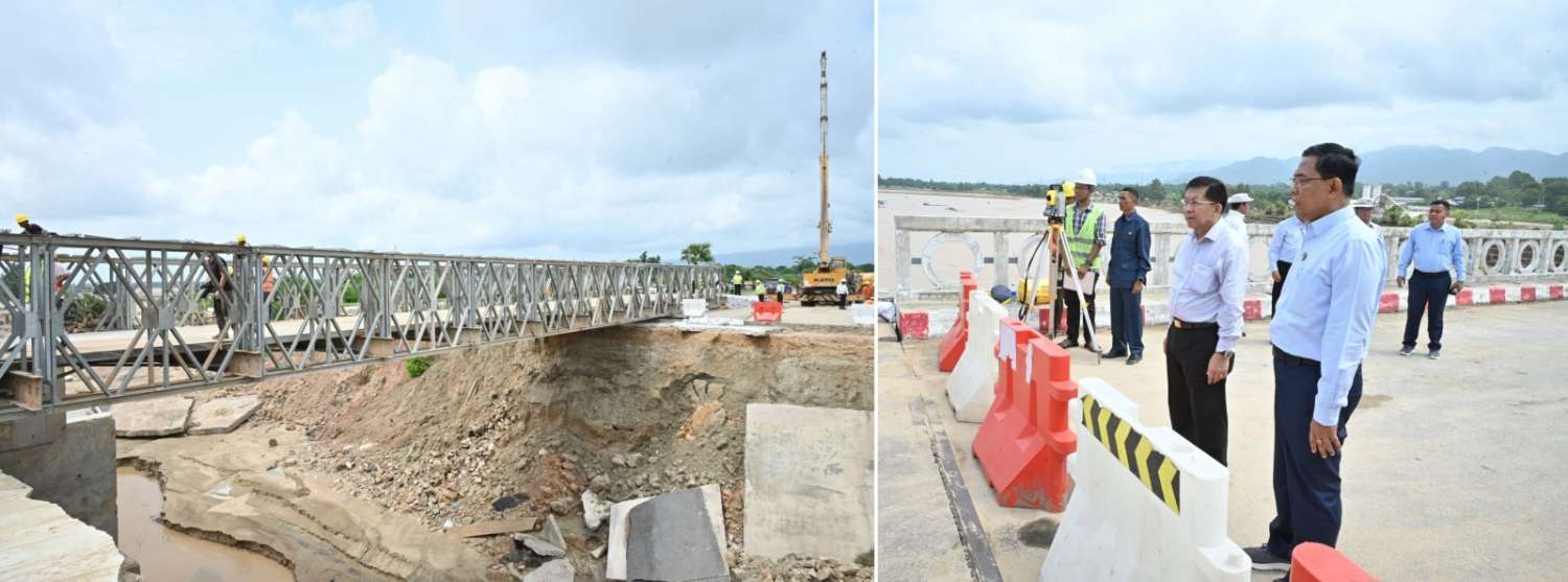 ထို့နောက် ဆက်လက်ပြီး နိုင်ငံတော်စီမံအုပ်ချုပ်ရေးကောင်စီဥက္ကဋ္ဌ နိုင်ငံတော်ဝန်ကြီးချုပ်နှင့် အဖွဲ့ဝင်များသည် ပြင်ဆင်တည်ဆောက်ပြီးစီးပြီဖြစ်သည့် ယာယီဘေလီတံတားပေါ်မှ မော်တော်ယာဉ်များဖြင့် မောင်းနှင်ဖြတ်သန်းခဲ့ပြီး ရေကြီးရေလျှံမှုကြောင့် ဖြစ်ပေါ်ခဲ့သည့် အပျက်အစီးများ ရှင်းလင်းခြင်းလုပ်ငန်း ဆောင်ရွက်နေမှုများကို လှည့်လည်ကြည့်ရှုစစ်ဆေးခဲ့ကြောင်း သတင်းရရှိသည်။