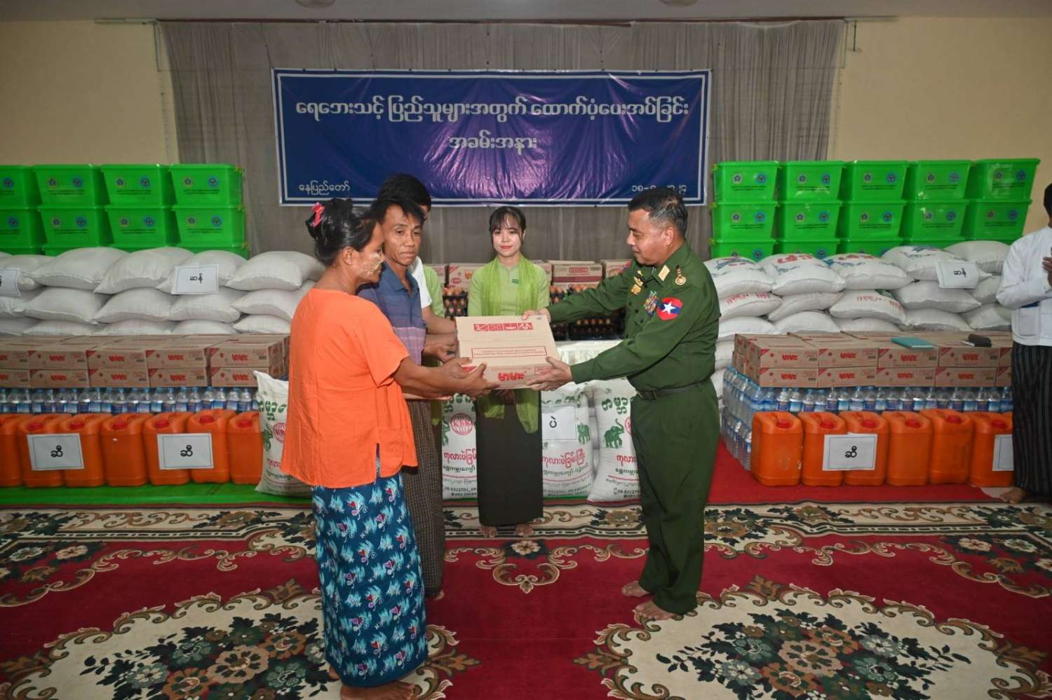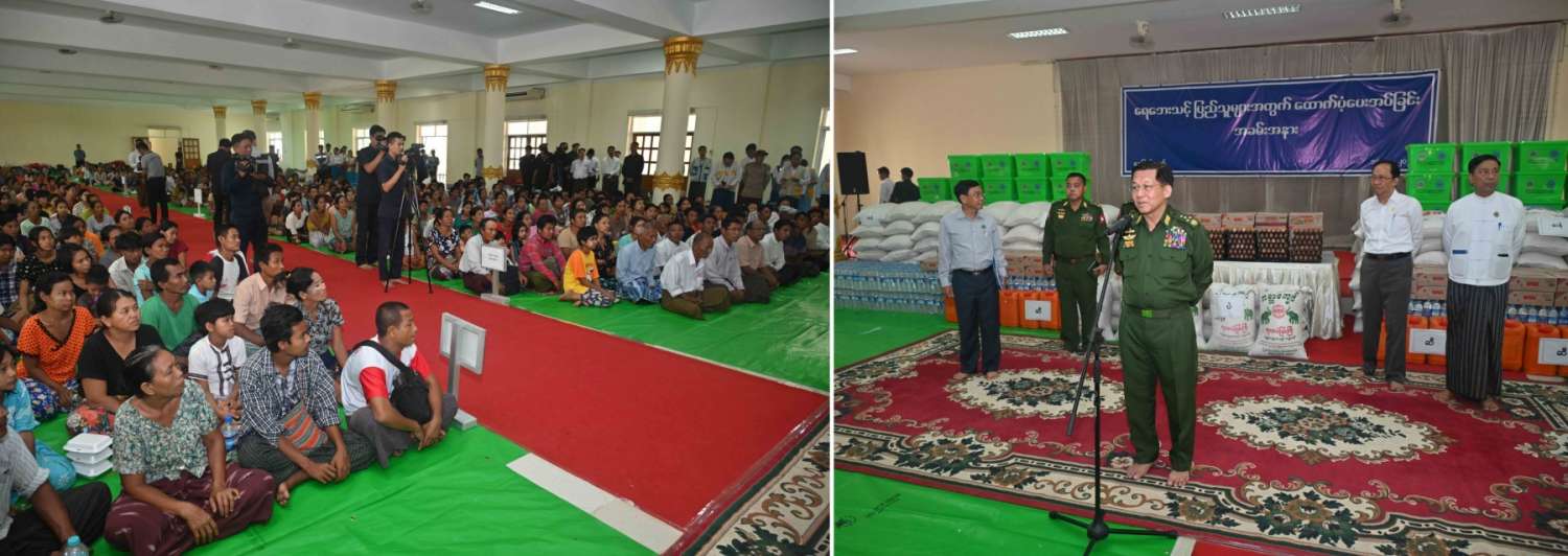 ထို့နောက် နိုင်ငံတော်စီမံအုပ်ချုပ်ရေးကောင်စီဥက္ကဋ္ဌ တပ်မတော်ကာကွယ်ရေးဦးစီးချုပ် ရေဘေးသင့်ပြည်သူများအတွက် ထောက်ပံ့ငွေနှင့်စားသောက်ဖွယ်ရာ ပစ္စည်းများကိုပေးအပ်ရာ ရေဘေးသင့်ပြည်သူများကိုယ်စား ကိုယ်စားလှယ်များက လက်ခံရယူသည်။