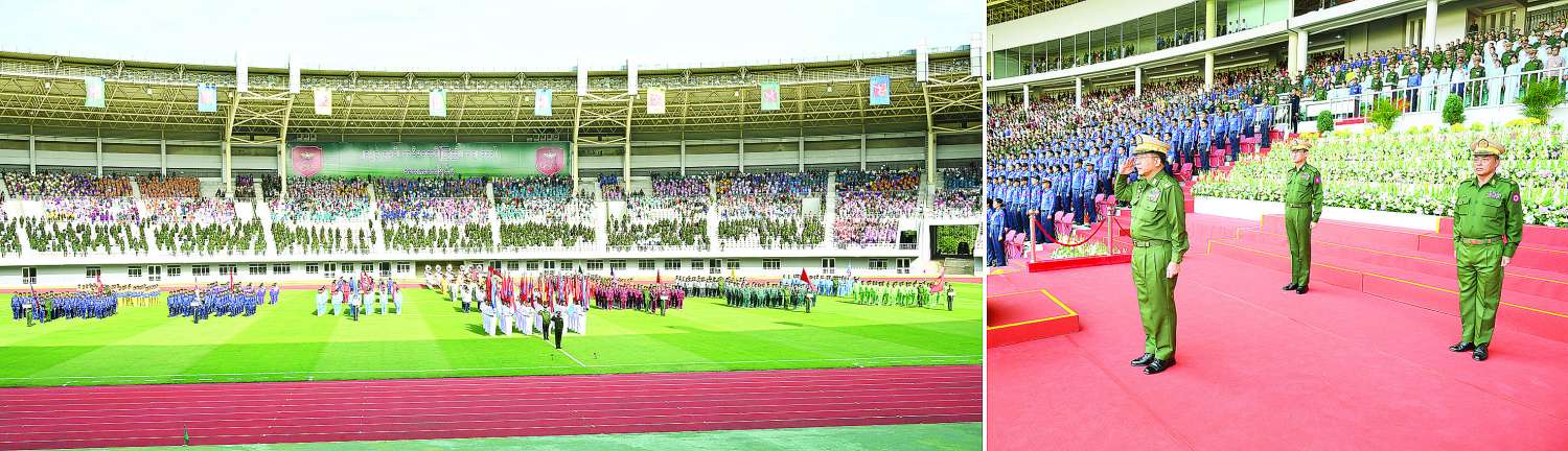 ယင်းနောက် နိုင်ငံတော်စီမံအုပ်ချုပ်ရေးကောင်စီဥက္ကဋ္ဌ တပ်မတော်ကာကွယ်ရေးဦးစီးချုပ်သည် စစ်ရေးပြမှူးကြီး ဦးဆောင်သော အလံတော်အဖွဲ့နှင့် အားကစားသမားများ၏ အလေးပြုခြင်းကိုခံယူသည်။