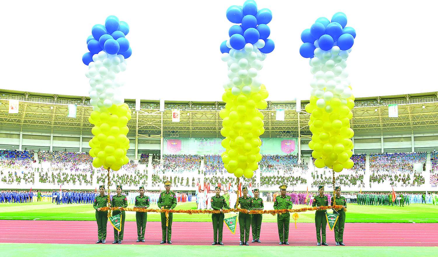 အဆိုပါအခမ်းအနားသို့ နိုင်ငံတော်စီမံအုပ်ချုပ်ရေးကောင်စီဥက္ကဋ္ဌ တပ်မတော်ကာကွယ်ရေးဦးစီးချုပ် ဗိုလ်ချုပ်မှူးကြီး မင်းအောင်လှိုင်နှင့်အတူ ဇနီး ဒေါ်ကြူကြူလှ၊ နိုင်ငံတော်စီမံအုပ်ချုပ်ရေးကောင်စီ ဒုတိယဥက္ကဋ္ဌ ဒုတိယတပ်မတော်ကာကွယ်ရေးဦးစီးချုပ် ကာကွယ်ရေးဦးစီးချုပ်(ကြည်း) ဒုတိယဗိုလ်ချုပ်မှူးကြီး စိုးဝင်းနှင့် ဇနီး ဒေါ်သန်းသန်းနွယ်၊ ကောင်စီဝင်ညှိနှိုင်းကွပ်ကဲရေးမှူး(ကြည်း၊ ရေ၊ လေ) ဗိုလ်ချုပ်ကြီး မောင်မောင်အေးနှင့် ဇနီး၊ ပြည်ထောင်စုအဆင့်ပုဂ္ဂိုလ်များ၊ ပြည်ထောင်စုဝန်ကြီးများနှင့် ဇနီးများ၊ ကာကွယ်ရေးဦးစီးချုပ်ရုံးမှ အဆင့်မြင့်တပ်မတော်အရာရှိကြီးများနှင့် ဇနီးများ၊ နေပြည်တော်တိုင်းစစ်ဌာနချုပ်တိုင်းမှူး၊ ကာကွယ်ရေးဦးစီးချုပ်ရုံး (ကြည်း၊ ရေ၊ လေ)ရုံး/ဌာနများမှ အရာရှိ၊ စစ်သည်၊ မိသားစုများ၊ နိုင်ငံတော်ကာကွယ်ရေးတက္ကသိုလ်မှ သင်တန်းသားအရာရှိကြီးများ၊ နေပြည်တော်တိုင်းစစ်ဌာနချုပ် ကွပ်ကဲမှုအောက် တပ်ရင်း/တပ်ဖွဲ့များမှ အရာရှိ၊ စစ်သည်၊ မိသားစုများ၊ တပ်မတော်ဘောလုံး အကယ်ဒမီကျောင်းမှ သင်တန်းသားများ၊ ဖိတ်ကြားထားသူများနှင့် ပြိုင်ပွဲဝင်အားကစားသမားများ တက်ရောက်ကြသည်။