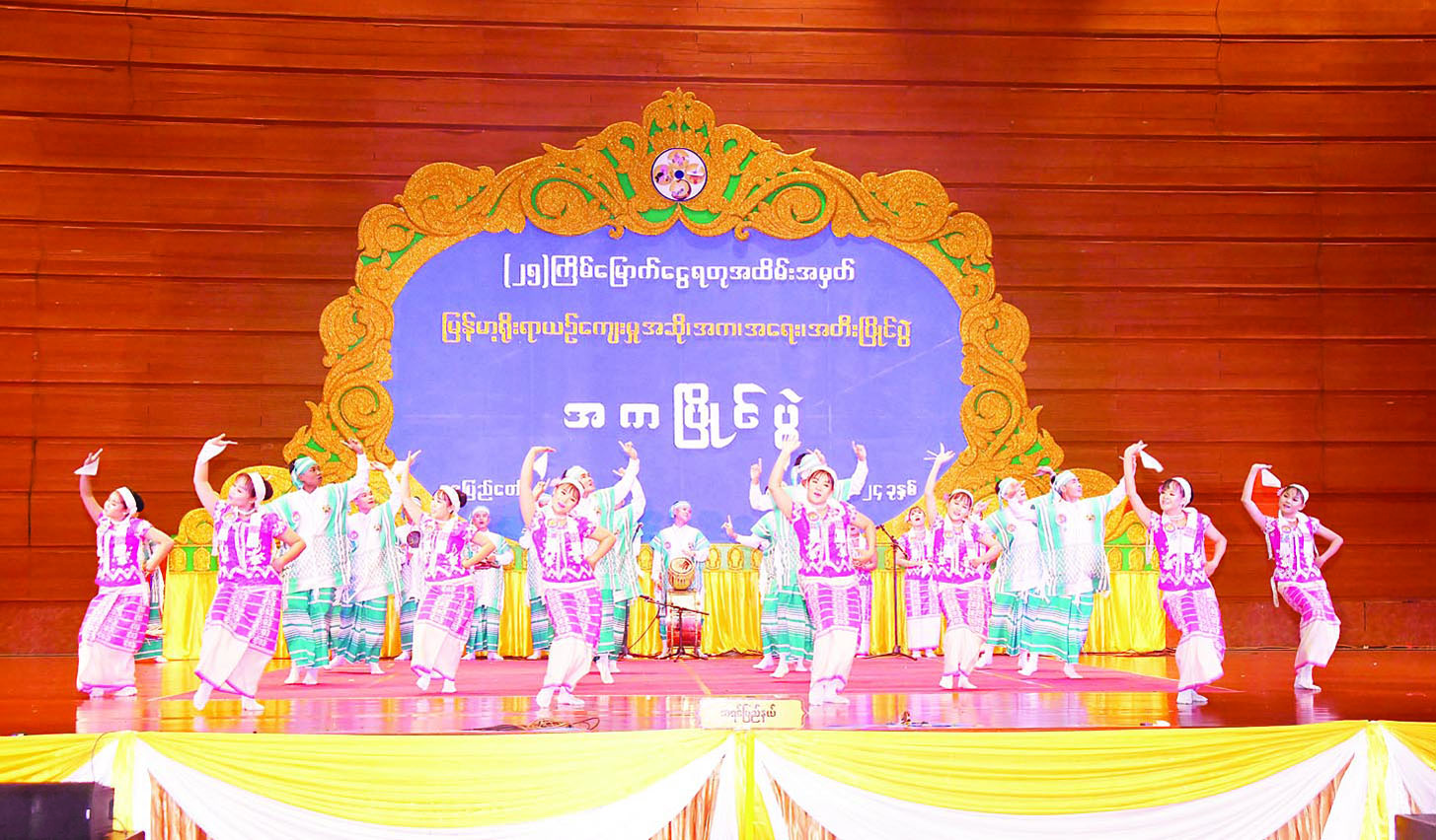 ဦးစွာ နိုင်ငံတော်စီမံအုပ်ချုပ်ရေးကောင်စီဥက္ကဋ္ဌ နိုင်ငံတော်ဝန်ကြီးချုပ်နှင့် ဇနီး၊ အဖွဲ့ဝင်များသည် Plenary Hall ၌ ကျင်းပလျက်ရှိသည့် တိုင်းရင်းသားရိုးရာ/ ကျေးလက်ရိုးရာ အလွတ်တန်းအဆင့်အကပြိုင်ပွဲတွင် တိုင်းဒေသကြီးနှင့်ပြည်နယ်အလိုက် ရိုးရာအကအဖွဲ့များက တိုင်းရင်းသားနှင့် ကျေးလက်ရိုးရာဓလေ့ စရိုက်များ ပေါ်လွင်စေသည့် အကအလှများဖြင့် အဖွဲ့လိုက် အချိုးအဆစ်ညီညာပြေပြစ် ရသမြောက်စွာ ကပြယှဉ်ပြိုင်နေမှုများကို အားပေးကြည့်ရှုကြသည်။